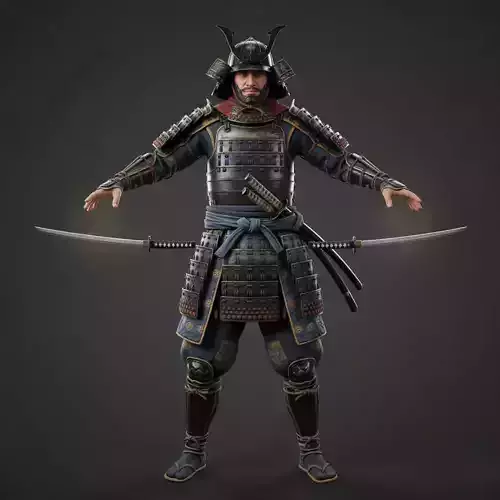 A high-detail 3D samurai warrior designed for action games and commercial projects.The character is a male with a disciplined posture, presented in T-Pose and front view, full body. He wears traditional layered samurai armor with a kabuto helmet and cloth under-armor. The calm, focused expression emphasizes discipline and readiness for battle.