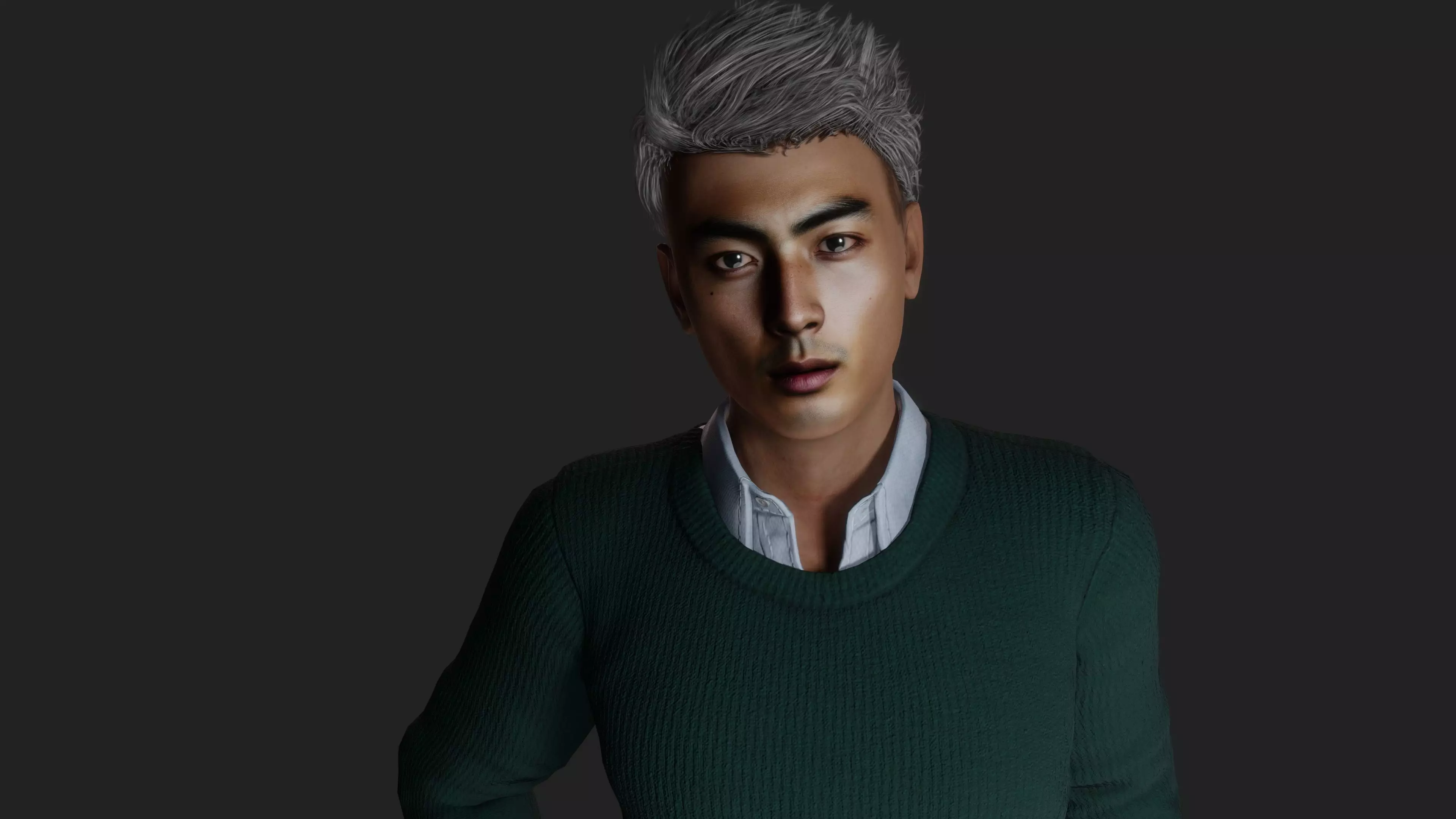 Introducing the Serene Sage 3D model, a meticulously crafted representation of a wise young oriental man exuding sophistication and style. This highly detailed and realistic model captures the essence of modern fashion, featuring the character with light gray, impeccably styled hair and a serious expression that adds an air of wisdom to his demeanor. The model boasts dark, lifelike skin, creating a striking contrast against the neutral tones of his attire.