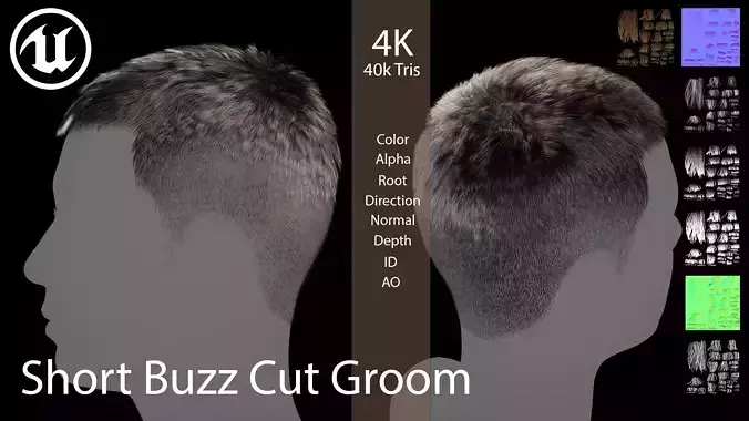 Short Buzz Cut Groom Realtime Hair is designed for use in games, cinematics, and real-time applications. Hair textures created with Fibershop and optimized for Unreal Engine 4-5, this asset delivers both performance and high visual quality.