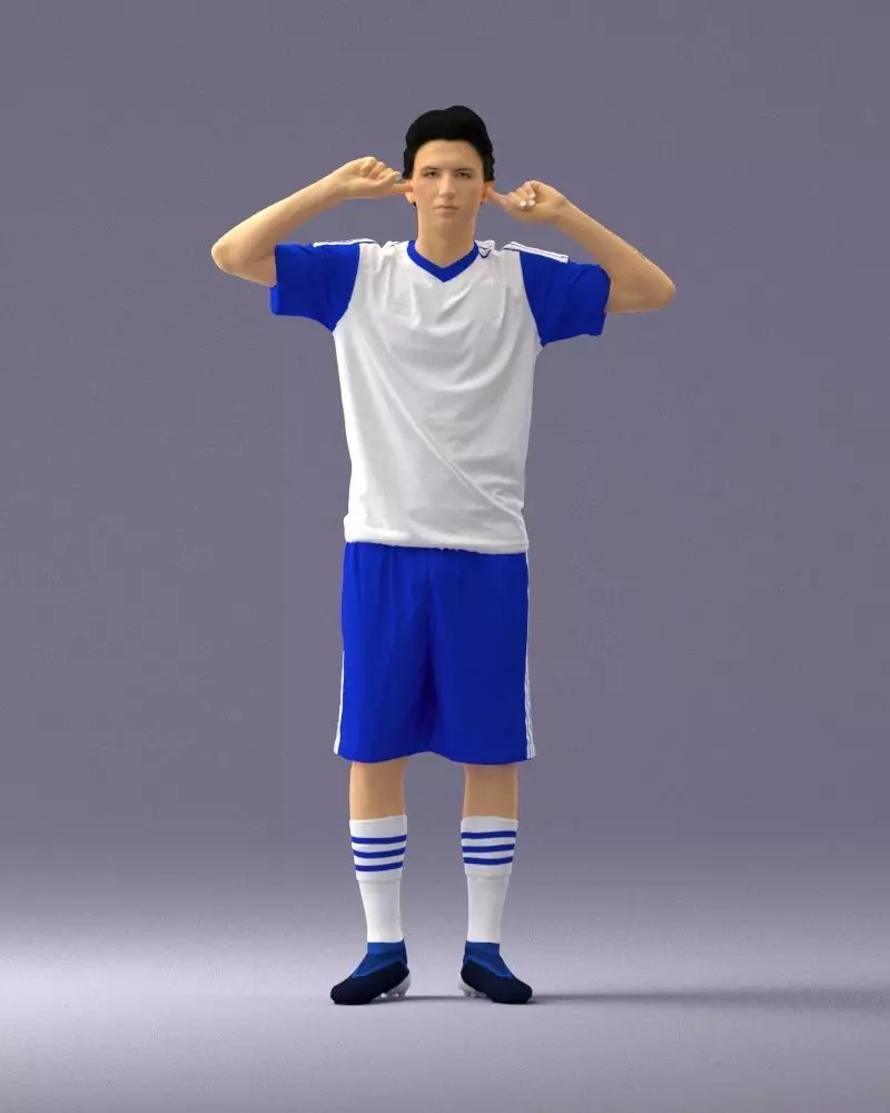 This realistic 3D scanned model of a male soccer player captures a dynamic pose with both hands lifted near the head — a natural human gesture seen in sports scenes such as celebration, reaction, or communication moments.Created using professional 3D scanning technology, it offers lifelike proportions, detailed clothing folds, and an expressive stance ideal for animation, rendering, and sports visualization.