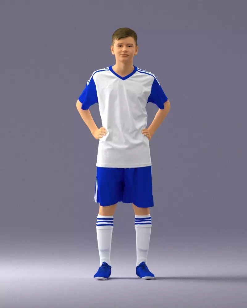 A highly detailed 3D scanned model of a young soccer player in a blue and white sports uniform. Captured using professional 3D scanning technology, this model delivers realistic proportions, clean geometry, and natural posture — ideal for creative or professional projects requiring realistic human characters.