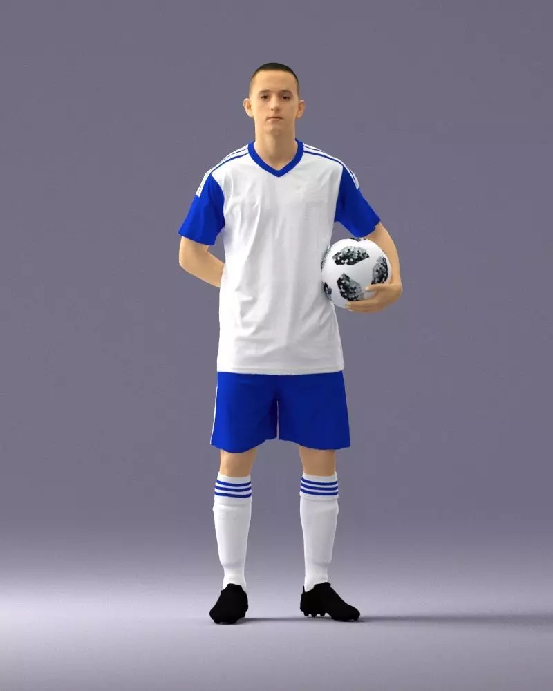 This realistic 3D scanned model of a male soccer player depicts an athlete in full uniform, standing upright and holding a football in one hand.Captured using 3D scanning technology, the model offers lifelike proportions, detailed surface geometry, and natural body posture — ideal for animation, rendering, sports visualization, and game design.