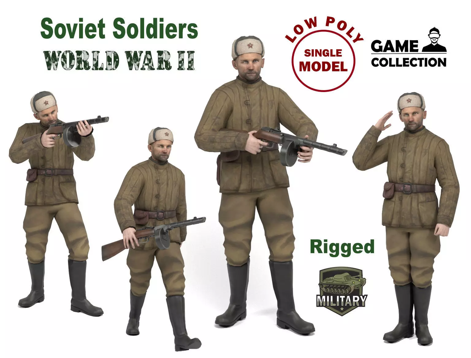 3D model of a soviet soldier of the second world war. Weapon included. The model includes bones and several animations. Model ideal to be used in games, advertising and video production. Low-poly models to be used easily in any project.
