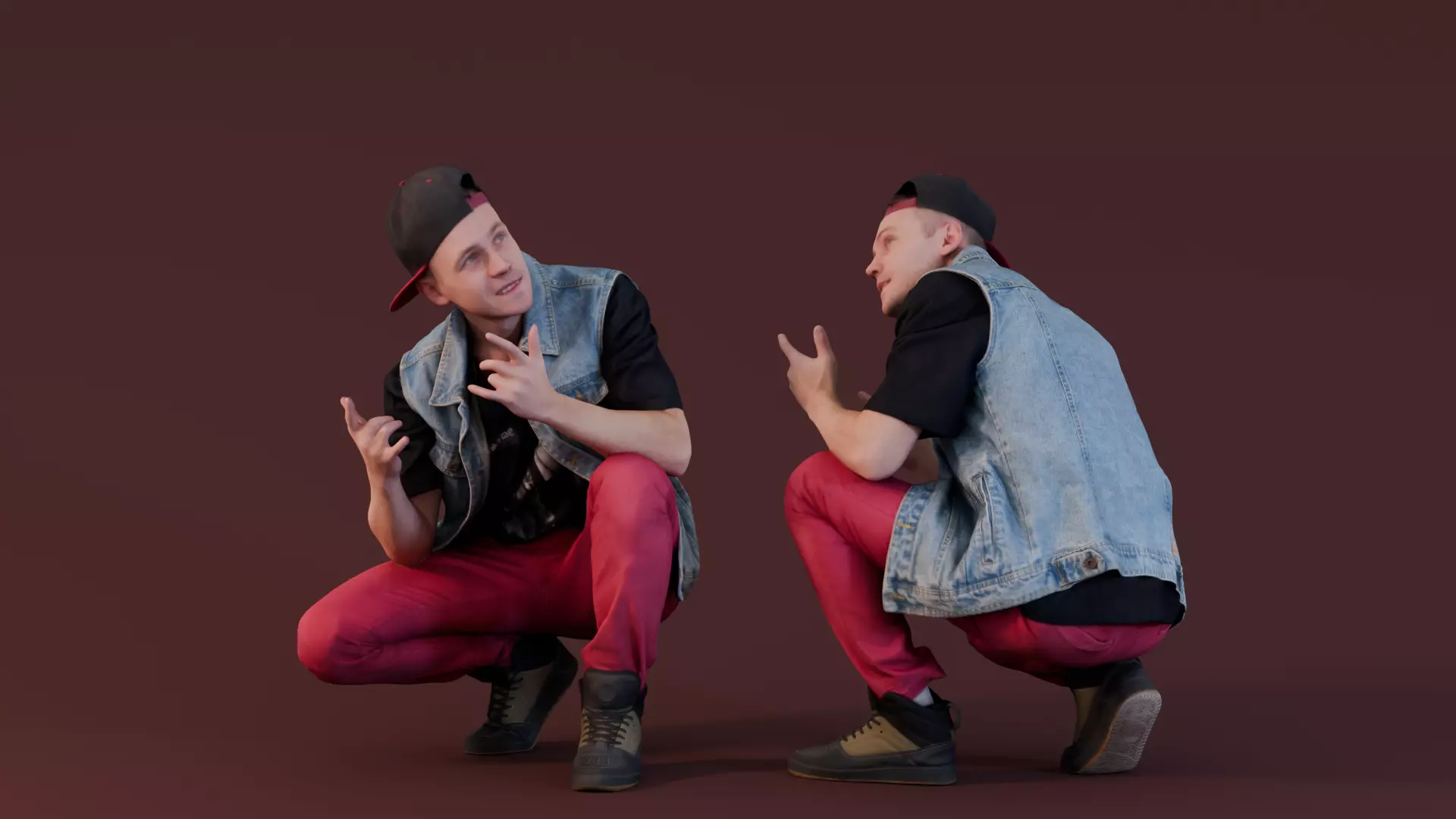 This 3D model depicts a young man crouched in a casual, street-style pose, wearing a denim vest over a black t-shirt and bold red pants. The backward cap and relaxed expression add to his urban, hip-hop vibe, making him an ideal fit for settings emphasizing modern, edgy fashion. His style brings energy and authenticity, perfect for street scenes, digital fashion showcases, or urban environments.