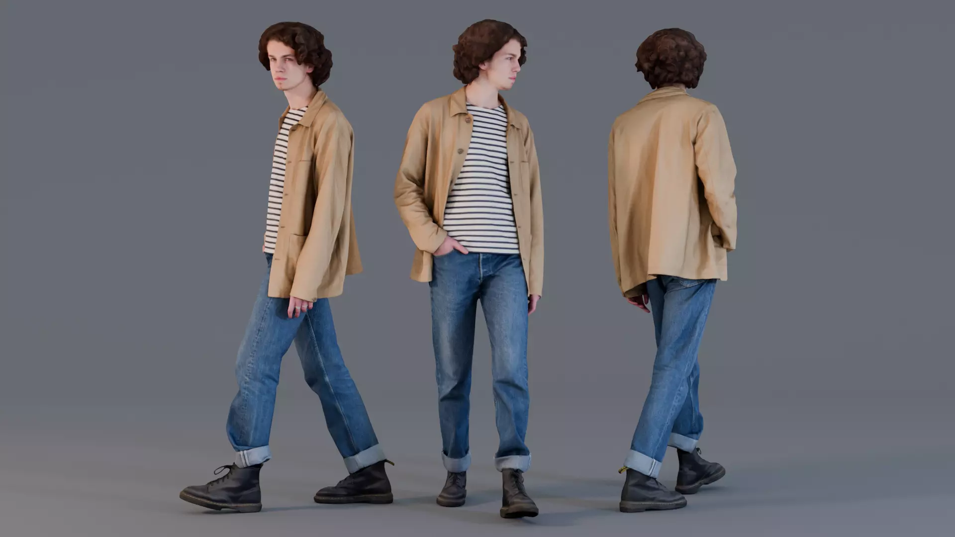 This 3D model captures a young man in a casual, fashionable look, strolling with confidence. Dressed in a relaxed beige jacket over a striped shirt and cuffed jeans, paired with classic boots, his style exudes a blend of urban chic and vintage influence. His walk radiates calm and poise, making him a perfect character for trendy, everyday scenarios.