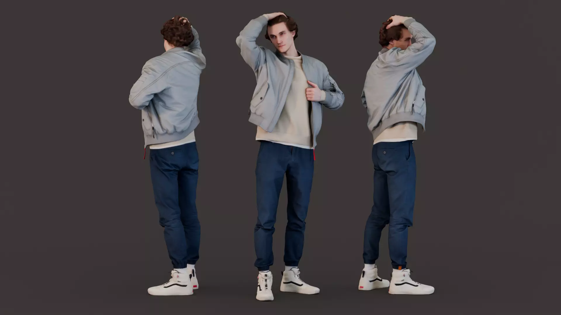 A trendy young man stands in a relaxed pose, adjusting his hair with one hand while casually holding his jacket with the other. He wears a light bomber jacket over a beige sweatshirt, paired with dark blue jogger-style pants and white high-top sneakers. His confident and effortless look makes him ideal for modern urban scenes, fashion showcases, or lifestyle projects. The model includes multiple angles, adding depth and versatility to scene compositions.