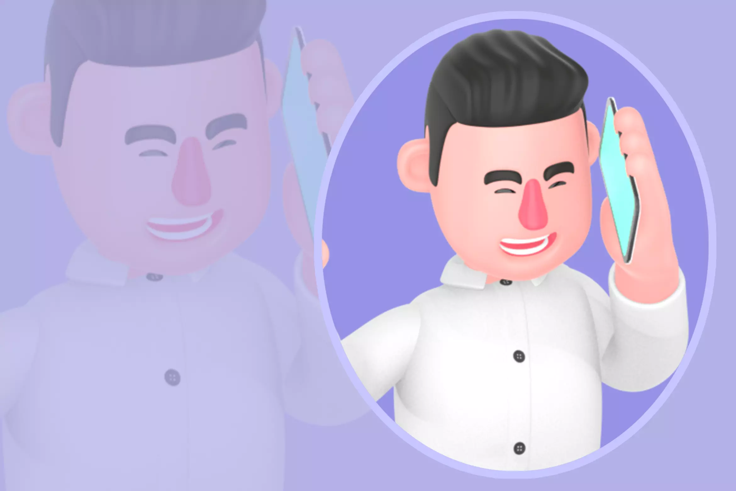 This stylized 3D male businessman character features a cartoon entrepreneur sitting cross-legged while talking on a mobile phone. He shows a cheerful laughing expression, with his right hand forming a small heart finger gesture, conveying happiness, positivity, and friendly communication.