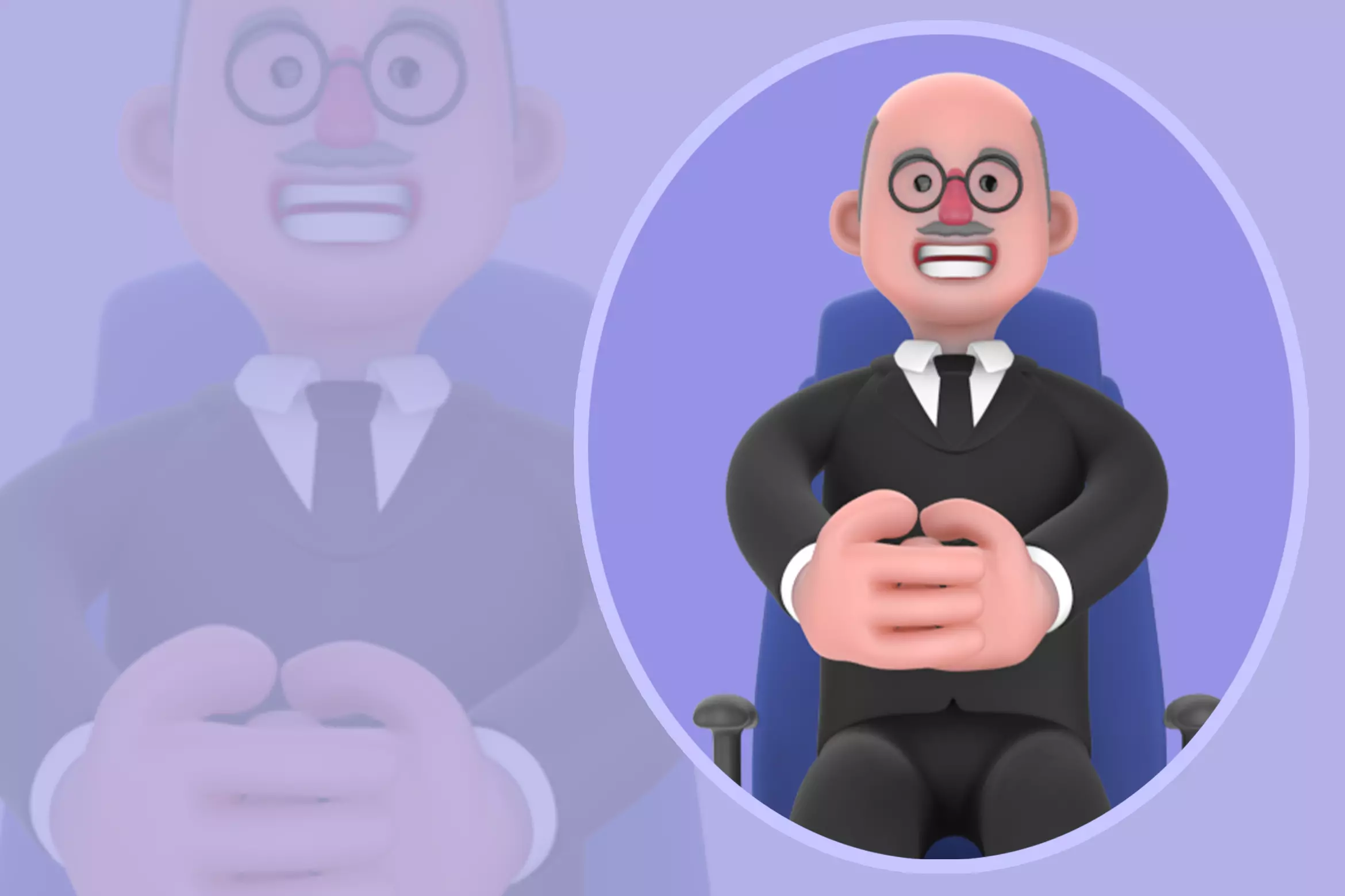This stylized 3D male judge character features a cartoon style court official sitting upright on a blue office chair with both hands clasped together and a very wide, enthusiastic smile. The character exudes energy, positivity, and a cheerful attitude, suitable for courtroom animations, educational content, or legal themed storytelling scenes.