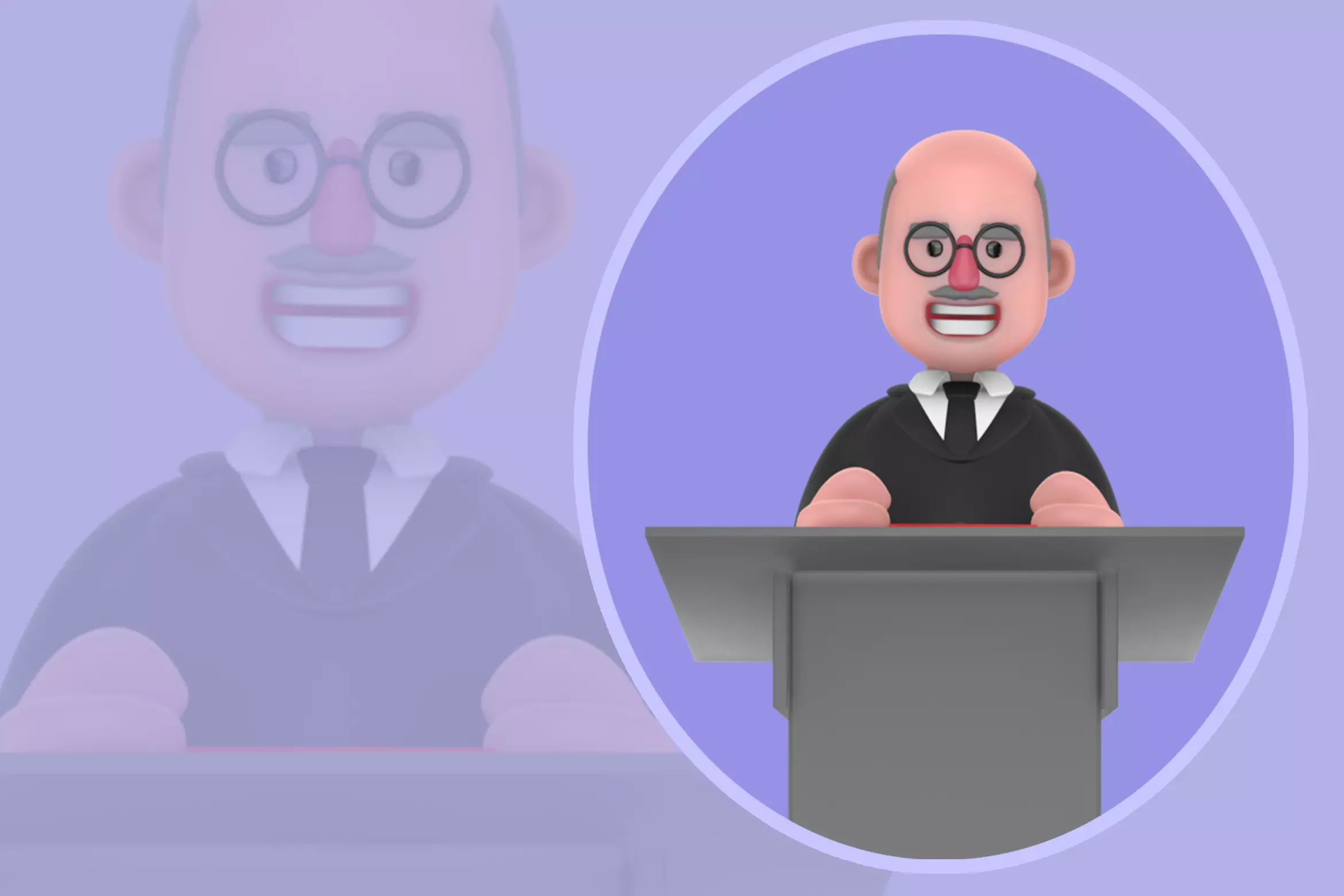This stylized 3D male judge character features a cartoon style court official standing upright behind a podium in a side view, preparing to press a red button with a focused facial expression. The pose represents attention, decision making, and engagement, suitable for courtroom animations, educational content, or interactive legal themed scenarios.