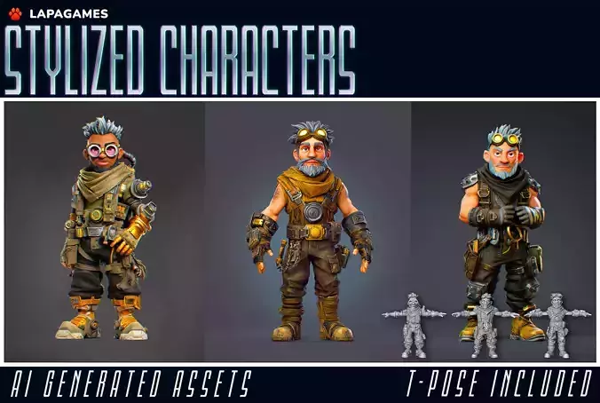 Exactly what you see in the preview:CharactersTech Explorer — goggles, scarf, tactical gloves, and “I’ve-seen-some-stuff” energyStylized Adventurer — sleeveless, confident, slightly too cheerful for dangerous missionsGadget Engineer — armor plates, utility belts, and big-brain expressionEach character comes in:Fully rendered posed versionClean T-pose version (for rigging, retargeting, or animation setup)Total models included: 6 GLB files (3 characters × 2 poses).