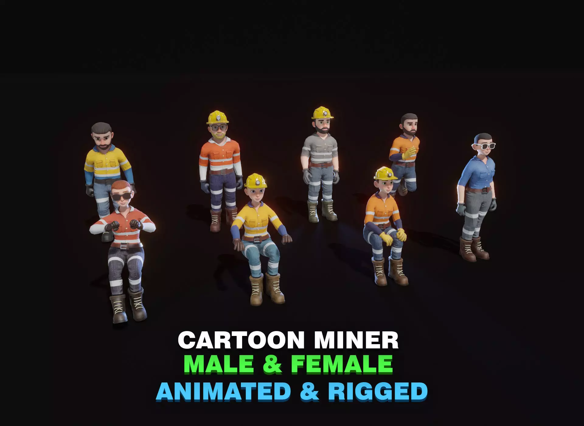 Stylized Male & Female Miner 3D Model – Animated & Customizable includes male & female characters with rig & 14 animations (idle_standing, walk, run, talk, pick_up, carry, point, sit_down, get_up, idle_sitting, wave, write, type, drive) & facial rig.