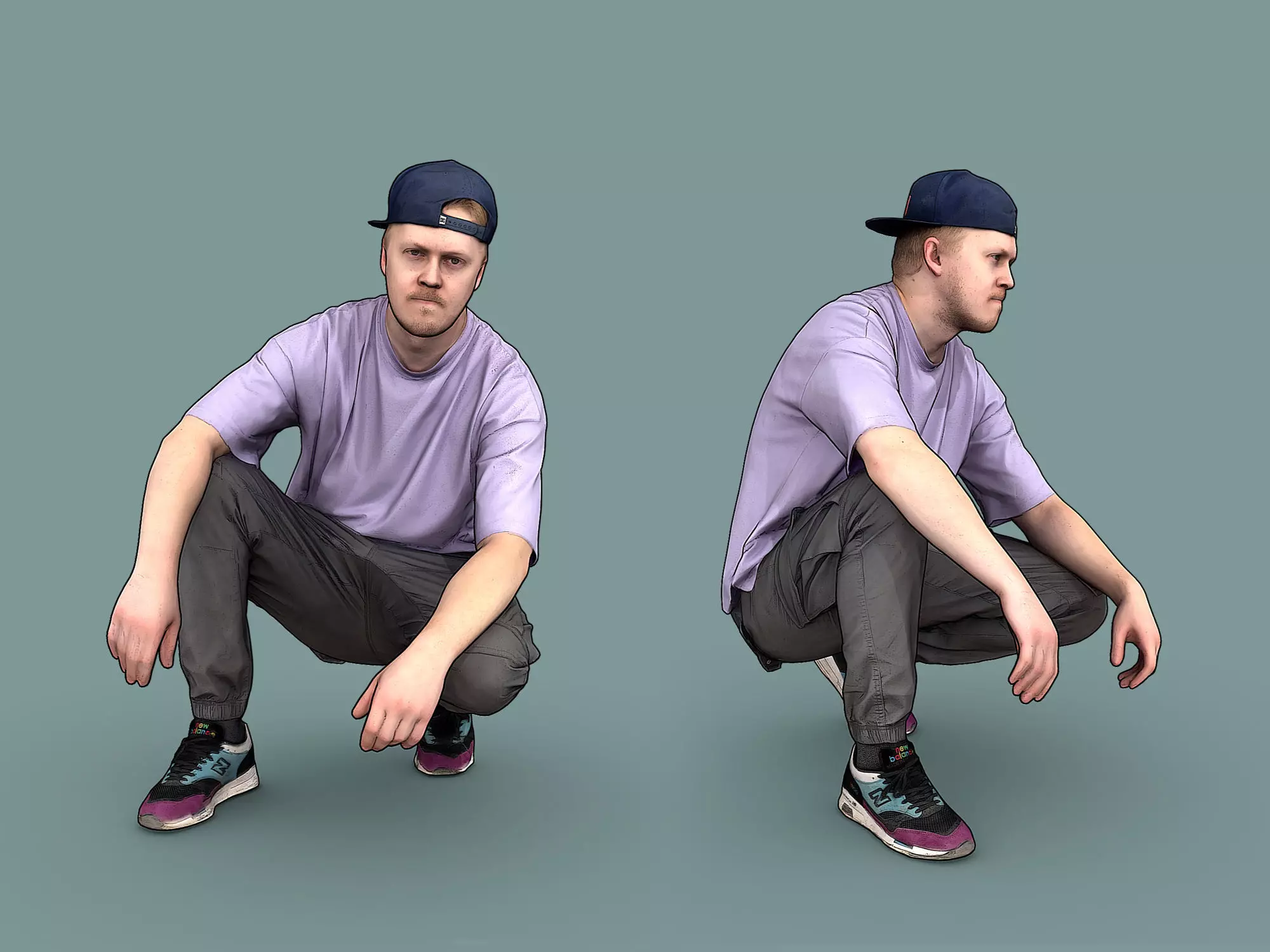 Guy in Purple T-shirt and Cap Squatting 3D model