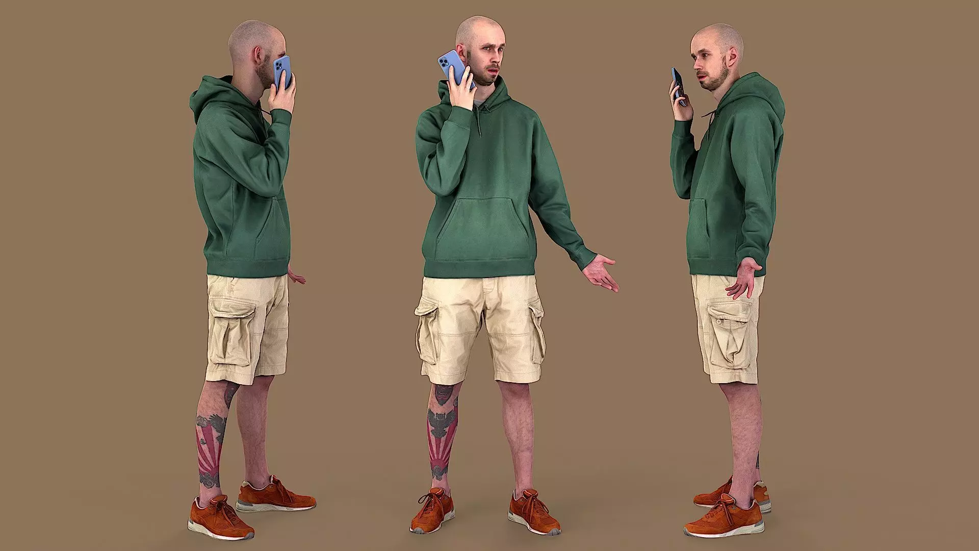Meet a bald young man caught in a moment of surprise. Dressed casually with a touch of hip urban style, he stands tall and strong. His green hoodie pairs well with his beige cargo shorts, showing a sense of youthful flair. His vibrant orange sneakers make a bold statement. However, the true standout feature is the intricate owl tattoo on his leg, a captivating symbol of wisdom and mystery.