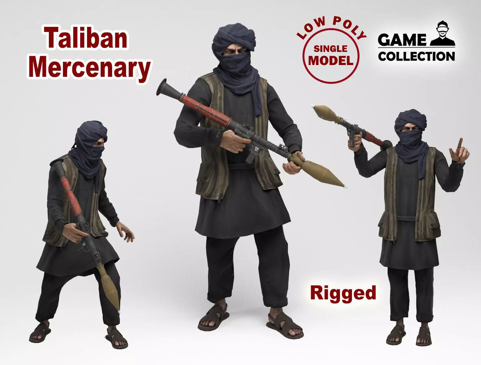 3D model of taliban mercenary . Weapon included. The model includes bones and several animations. Model ideal to be used in games, advertising and video production. Low-poly models to be used easily in any project.