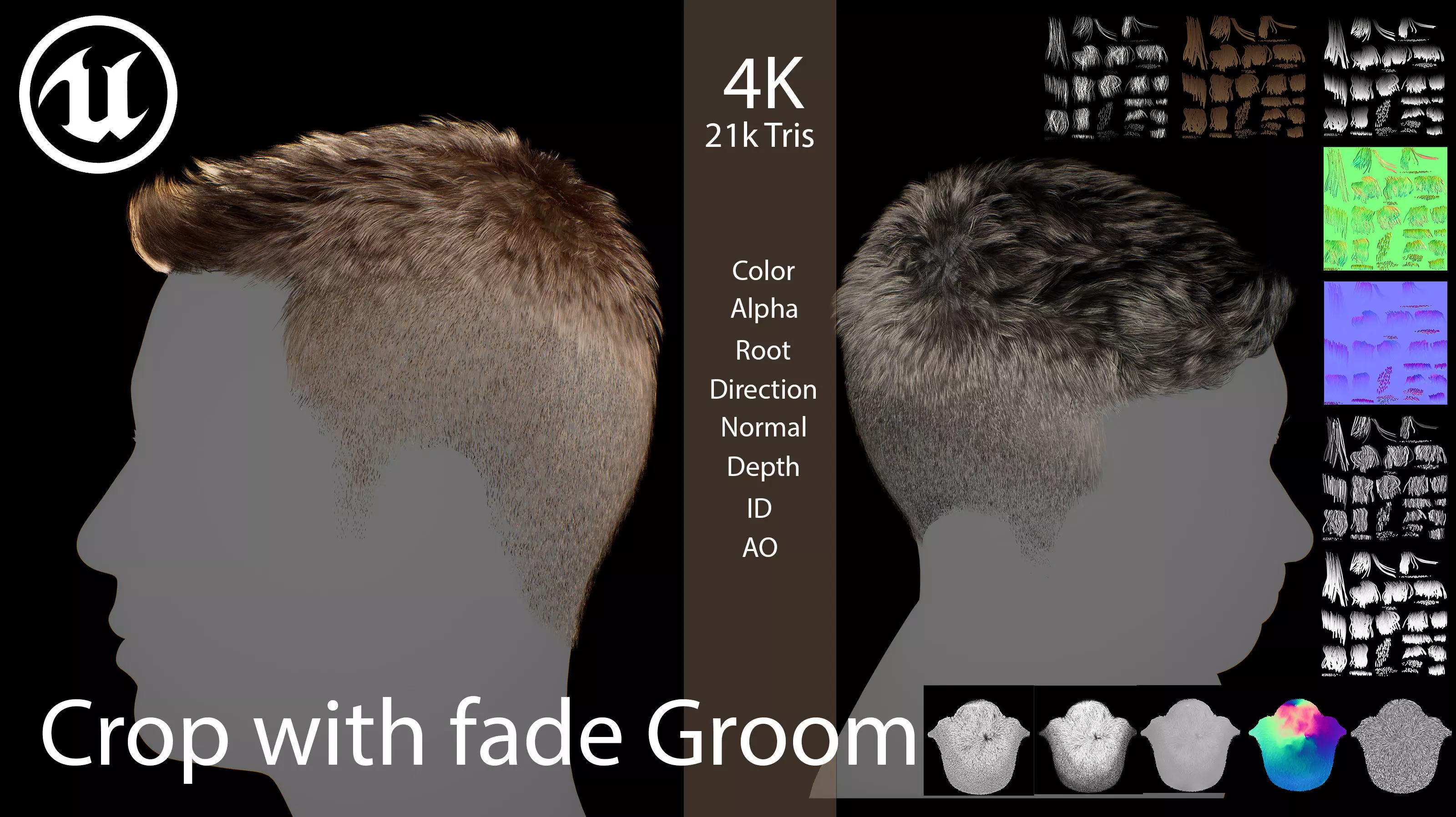 Textured crop with mid skin fade Realtime hair is designed for use in games, cinematics, and real-time applications. Hair textures created with Fibershop and optimized for Unreal Engine 4-5, this asset delivers both performance and high visual quality.