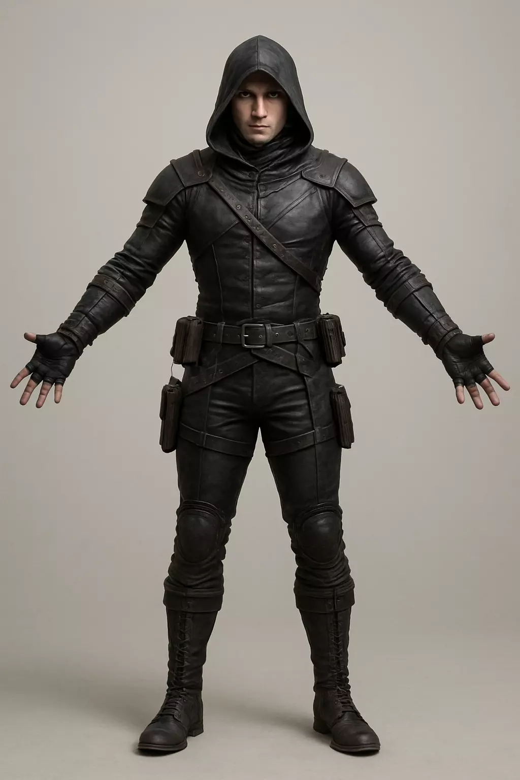 Fully rigged humanoid skeleton (animation-ready)Hooded silhouette; intense, serious expressionOutfit: leather-like chest armor with pauldrons, ribbed forearms, multiple belts and pouches, form-fitting pants with knee pads, tall lace-up boots, fingerless glovesMonochrome palette (black/graphite/gunmetal) with dulled metal hardwareNo weapons includedNeutral studio lighting for clean readabilityUse cases: stealth NPC/playable rogue, thieves’ guild archetype, key art and promo renders.