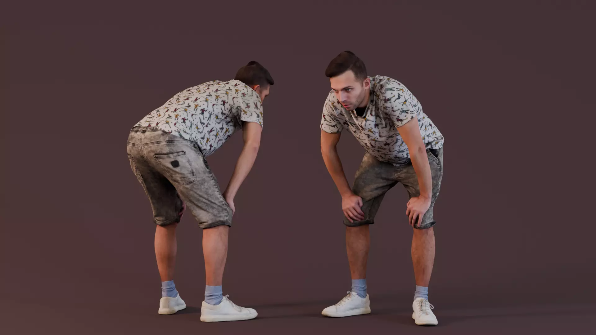 This 3D model features a young man leaning forward with his hands on his knees, as if he is catching his breath after some physical exertion. He is dressed casually in a playful patterned shirt, stonewashed denim shorts, and white sneakers. His expression shows a mix of focus and tiredness. The model captures a moment of pause, making him an ideal character for scenarios that involve physical activity or moments of rest.