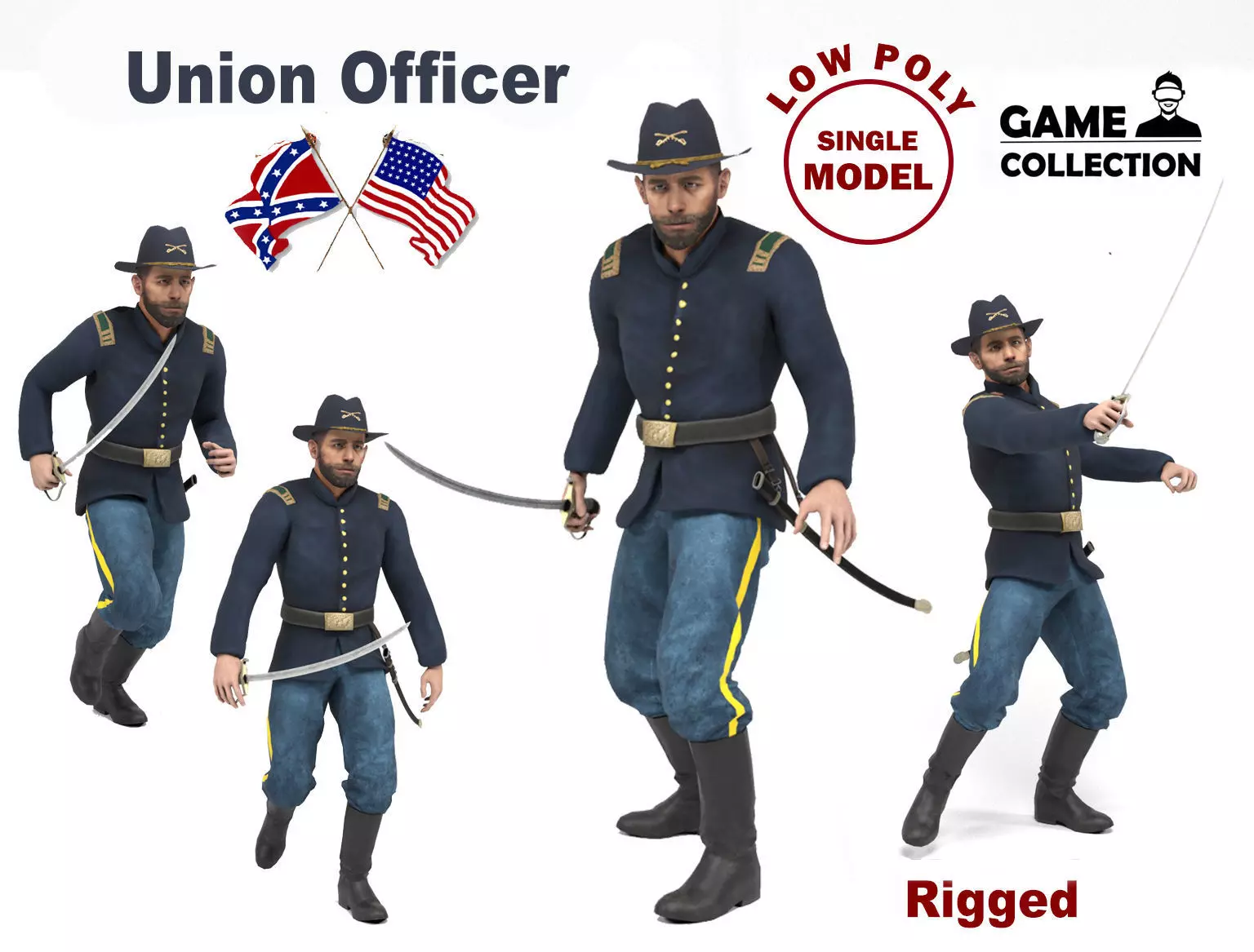 3D model of a Union officer (American Civil War in the United States). Weapon included. The model includes bones and several animations. Model ideal to be used in games, advertising and video production. Low-poly models to be used easily in any project.