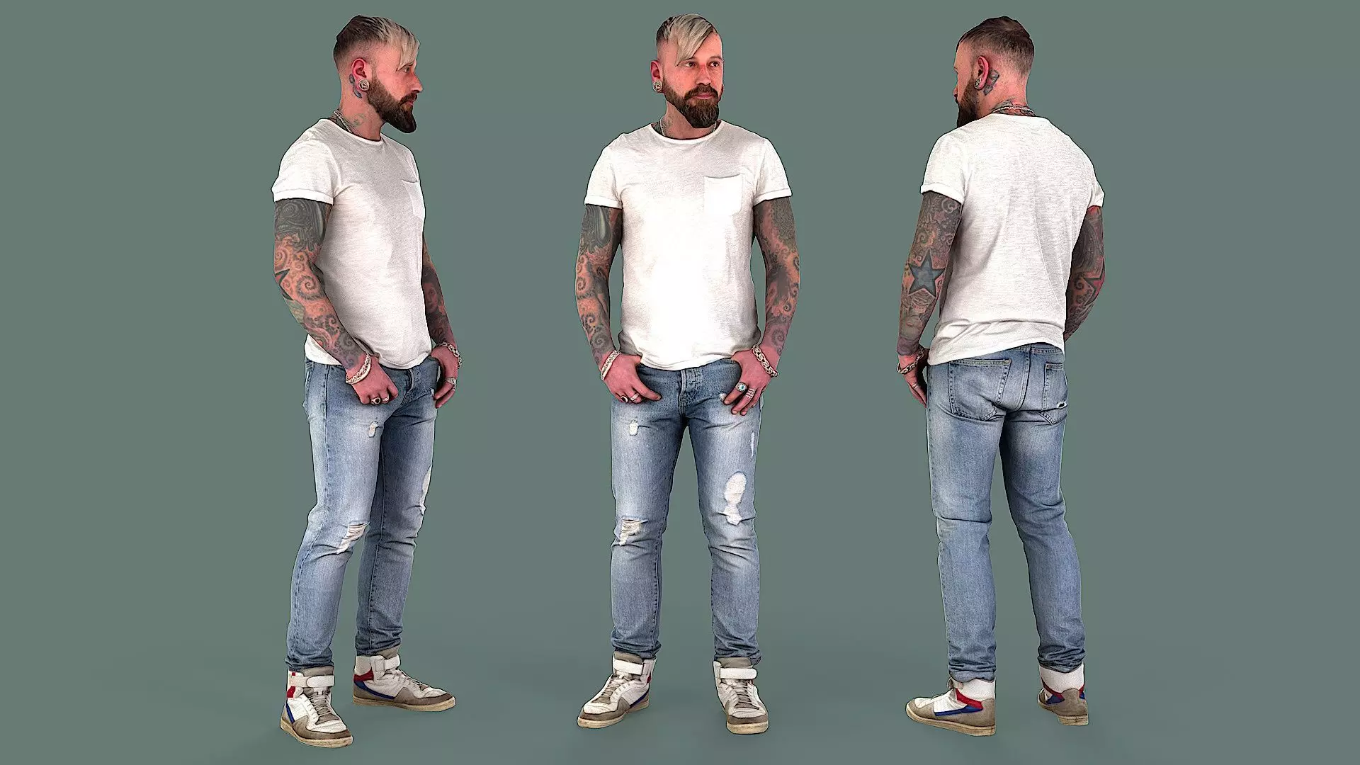 This young man is dressed in blue jeans with fashionable distressing and stylish holes, high-top sneakers, and a white t-shirt with a chest pocket. He is standing straight, hands with thumbs tucked into his pockets, looking slightly to the side. His hands are adorned with bracelets, rings, and fully tattooed, including prominent star tattoos on his elbows. He also has a necklace, ear tunnels, tattoos behind his ear and on his neck. He sports a short, light haircut with a side-swept fringe and a neatly trimmed beard with a mustache.
