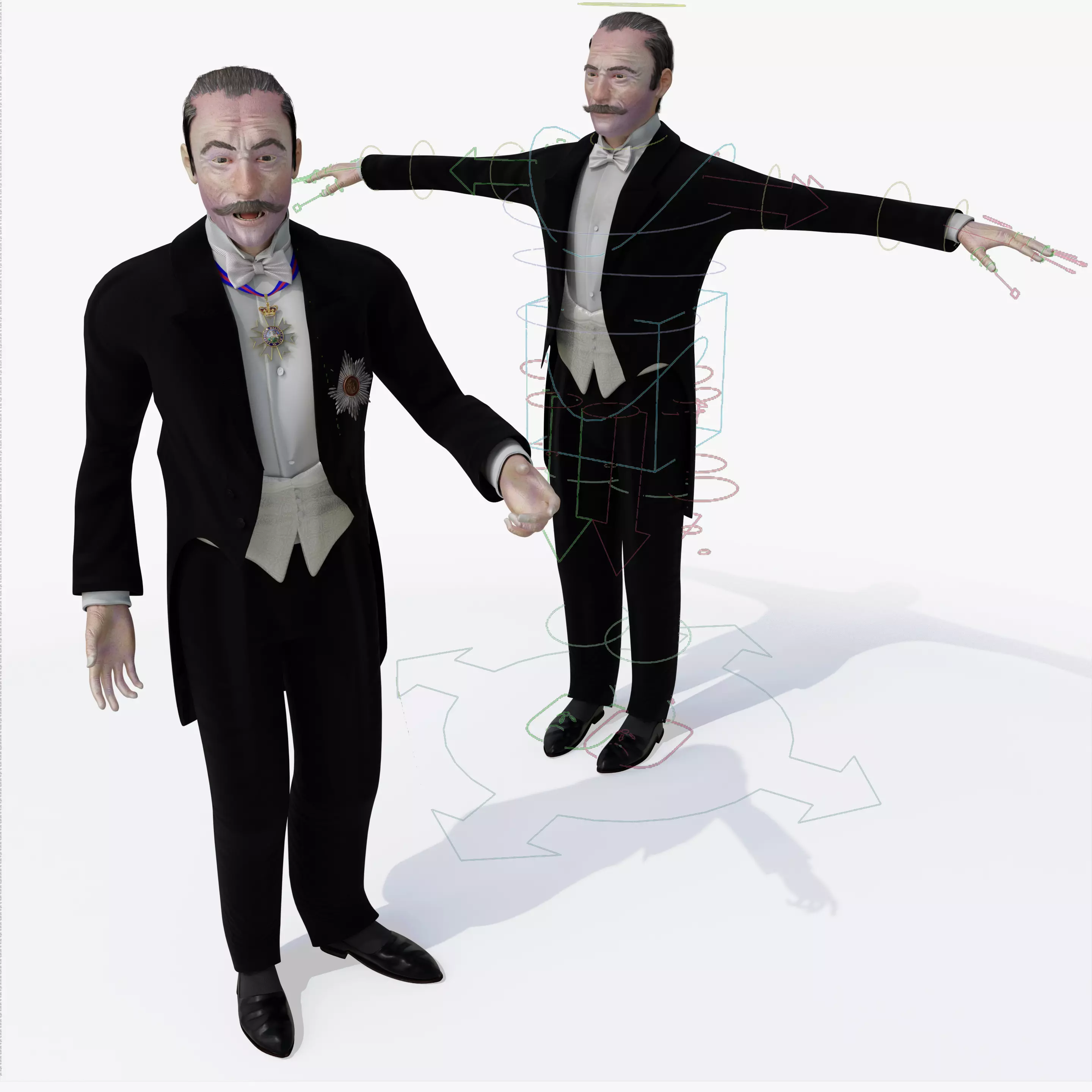 This model comes with several pre-animated scenes to get you started:The “-B” version of the scenes are the Tuxedoed Gent without the medals.VictDip_SIG-01e.blendVictDip_Test Positions.blendVictDip_ZERO.blendVictDip-B_Test Positions.blendVictDip-B_ZERO.blendVictDip-B-Walk-BowAnim.blend
