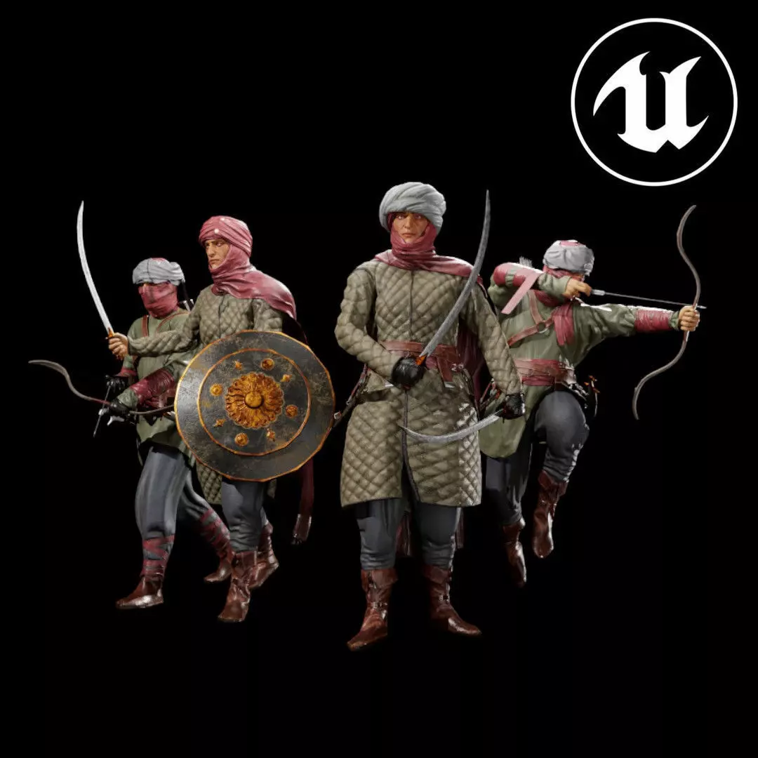 Assets: Armor1 (4656 tris), Armor2 (3991 tris), Arrows (1008 tris), BeltSwordLeft (1908 tris), BeltSwordRight (1908 tris), Body (12060), Cloak (2190 tris), Eyes (816 tris), Face (9862 tris), Gloves (5612 tris), Hands (5464 tris), Mask (246 tris), Neck1 (1442 tris), Neck2 (520 tris), Pants1 (2960 tris), Pants2 (2612 tris), Quiver (1947 tris), Turban1 (3339 tris), Turban2 (2393 tris), TurbanHead (1710 tris), Sword (584 tris), Bow (692 tris), Arrow (168 tris), Shield (504 tris).