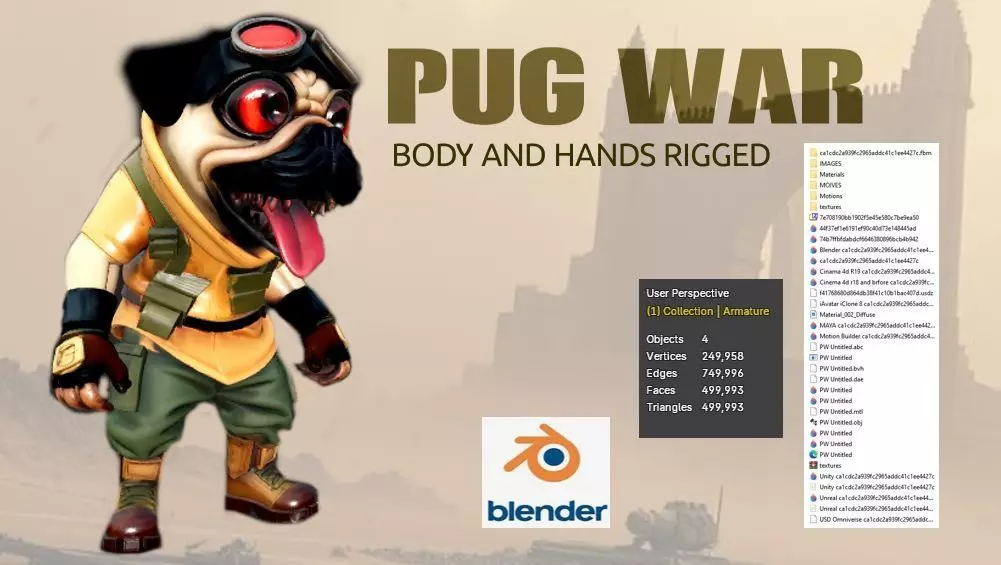 **Extensive File Format Support:* *The model is available in a wide range of formats for maximum compatibility with your workflow:3ds MaxBlenderCinema 4D R18 AND BEFORECinema 4D R19MayaMotionBuilderUnityUnreal Engine.abc.dae.mtl.obj.usdc.usdzFiles Included :IMAGESMaterialsMotionsMOVETexturesAnd other files in formats listed previously.The .mp4 and .gif files showing the Pug Warrior in motion allow for immediate visual reference and promotional use.Technical Details:Vertices: 249,958 Faces: 499,993Triangles: 499,631Objects: 4Software Used: Blender