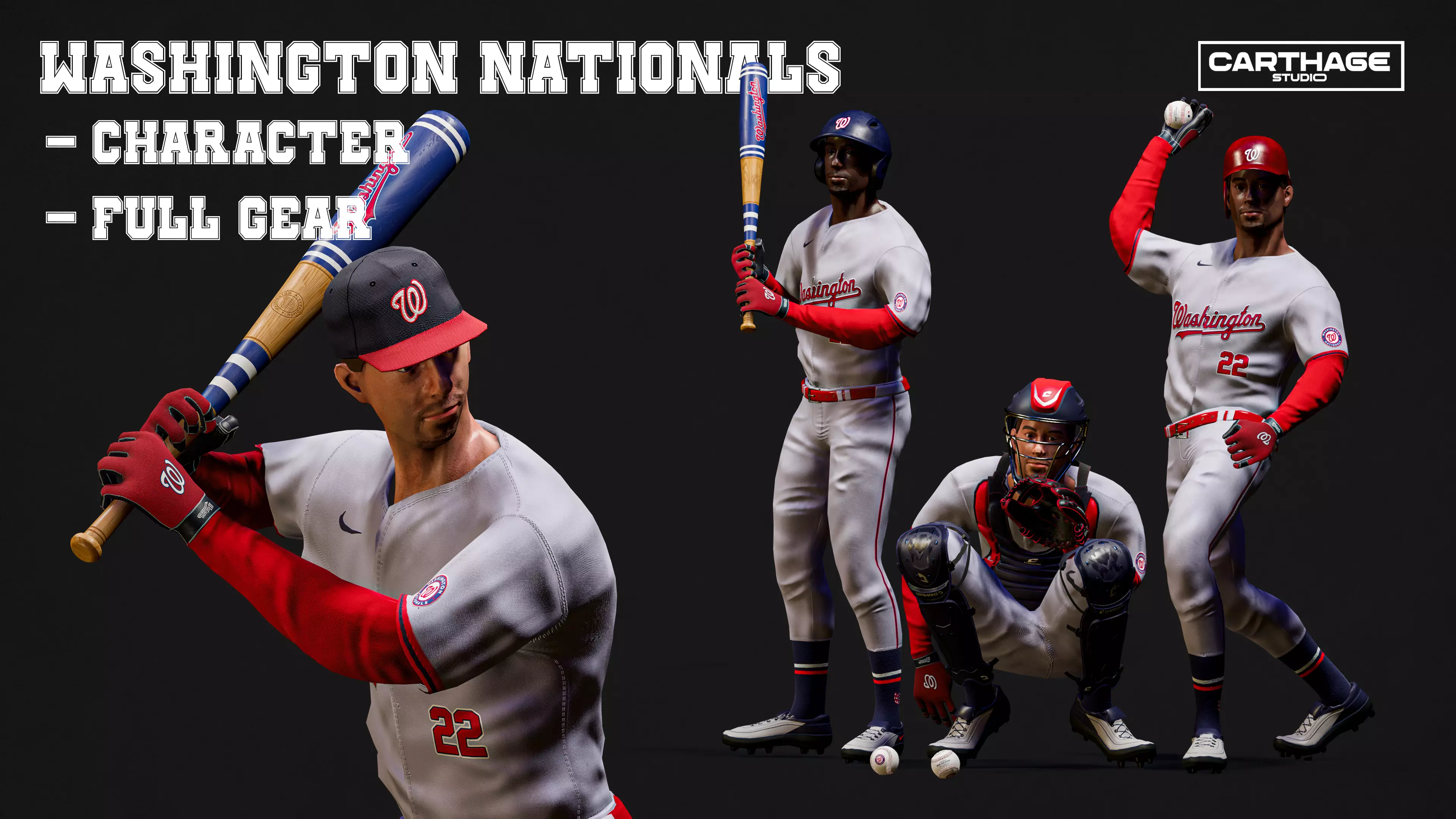 Washington Nationals Character And Essential Baseball Equipments Low-poly 3D model