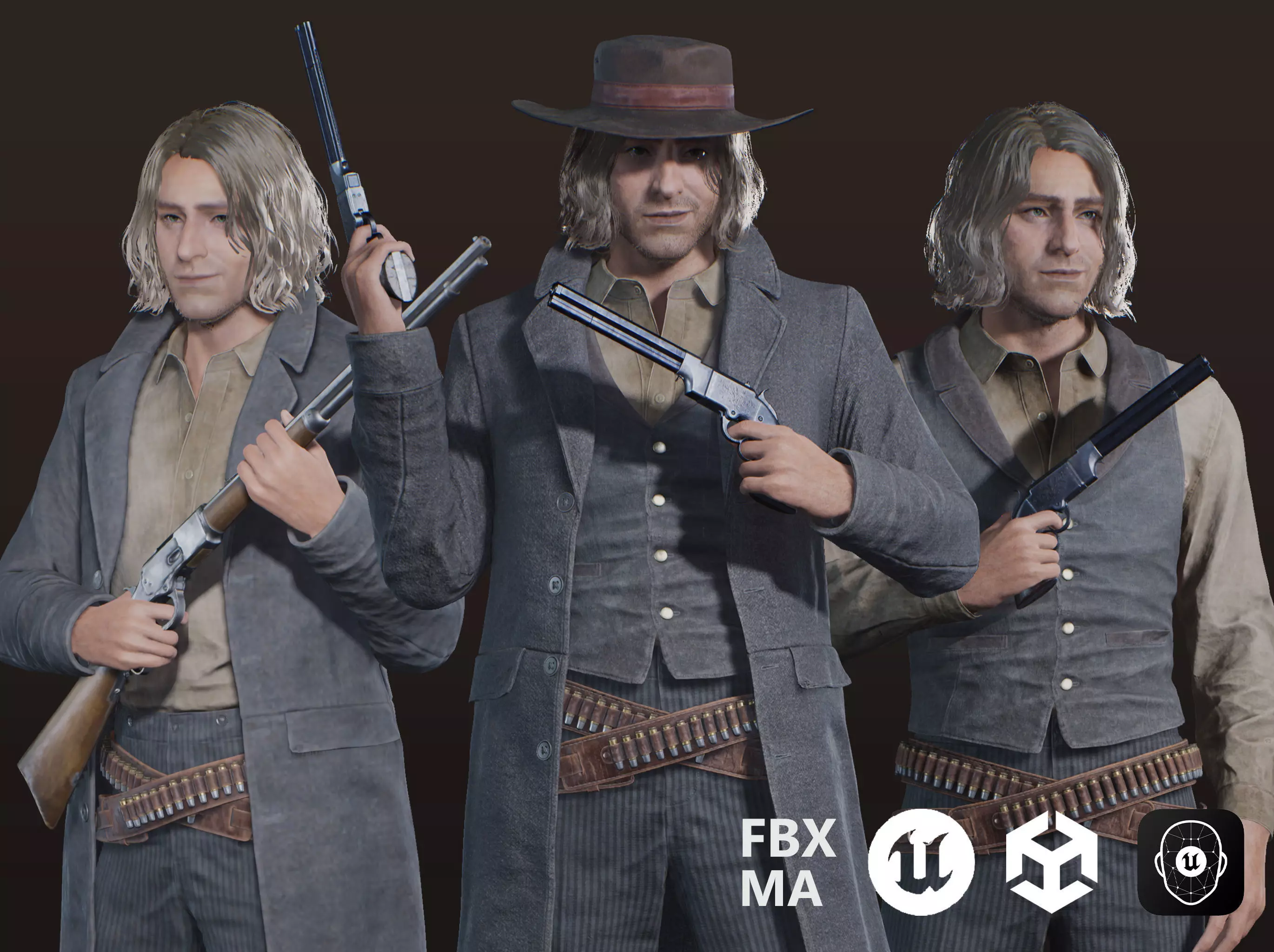 Appearance: An elegant gunslinger with an aristocratic past. His dark coat, refined look, and icy gaze mark him as a man of high birth who’s turned to vengeance. Modular outfit: coat, vest, shirt.Personality: Calculated, charismatic, operates with precision and composure.Goal: To find the traitor who took everything from him.