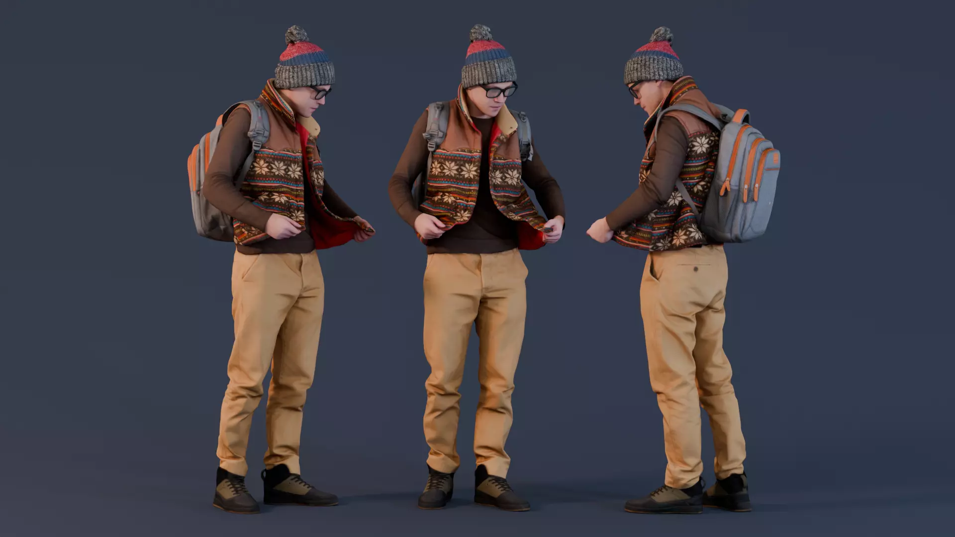 This photorealistic 3D model features a young man dressed for the winter season, adjusting his colorful patterned vest over a long-sleeved shirt. He wears a cozy knit beanie with a pom-pom, beige trousers, and stylish lace-up shoes. His casual look is completed with glasses and a large backpack slung over his shoulders, making him ideal for urban or campus environments. The model is portrayed in a realistic stance, zipping up his vest, giving an impression of a chilly day.