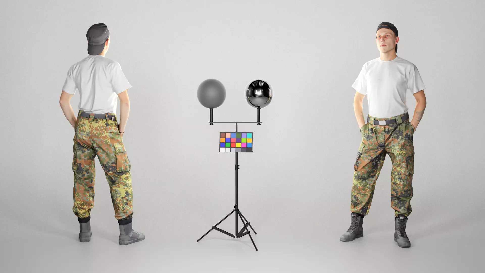 This is a true human size detailed model of a brave soldier dressed in Bundeswehr uniform. The model is captured in casual pose to be perfectly matching to variety of architectural visualization, background character, reconstruction, performance, etc.