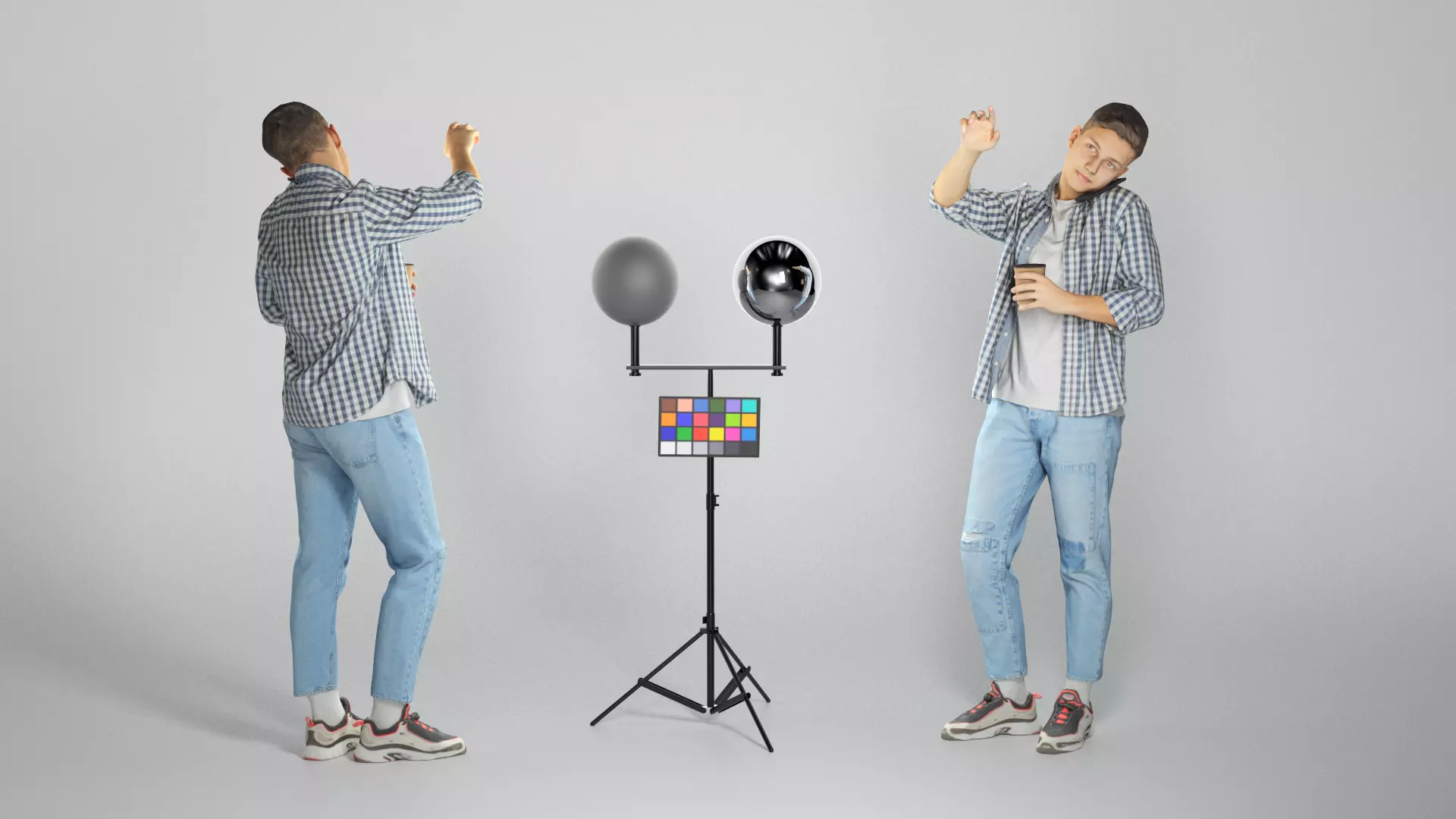 This is a true human size and detailed model of a young handsome man of Caucasian appearance dressed in casual style with cup of coffee. The model is captured in casual pose to be perfectly matching to variety of architectural visualization, background character, product visualization e.g. urban installations, city designs, outdoor design presentations, VR/AR content etc.