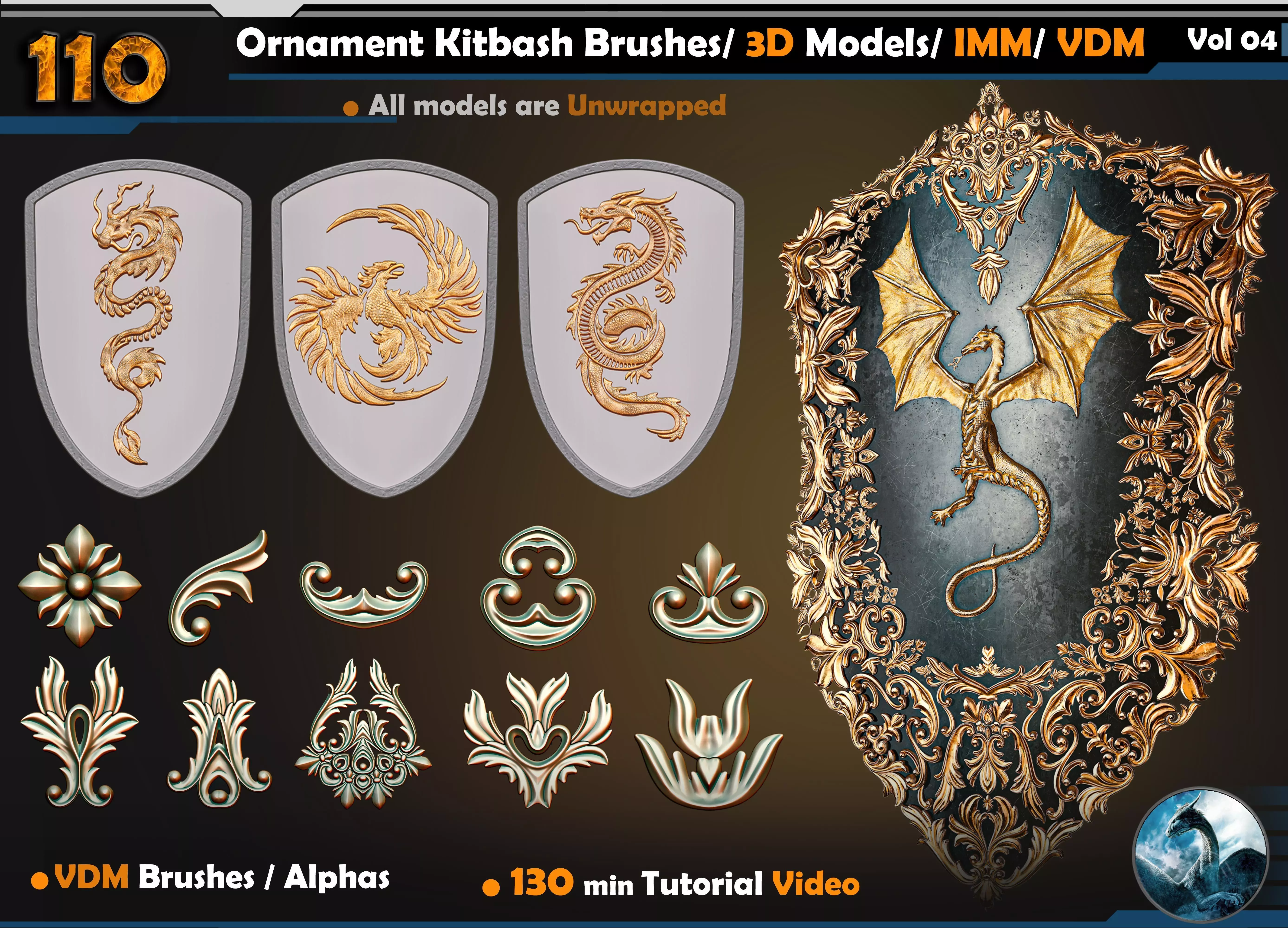 This Product include 110 Ornament Kitbash Brushes/ 3D Models/ IMM/ VDM Vol 04