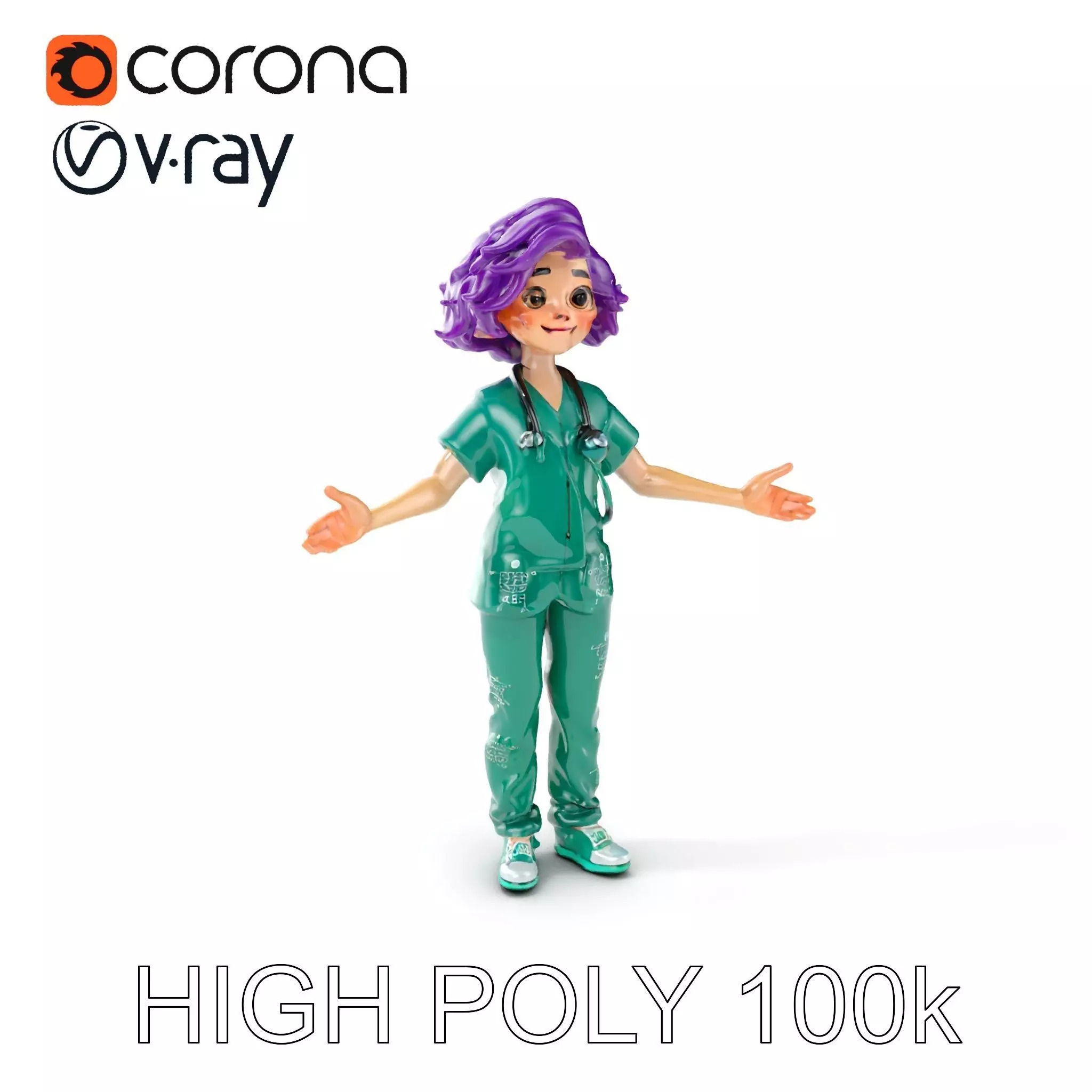 Animated D Medical Character with Purple Hair and Stethoscope Low-poly 3D model