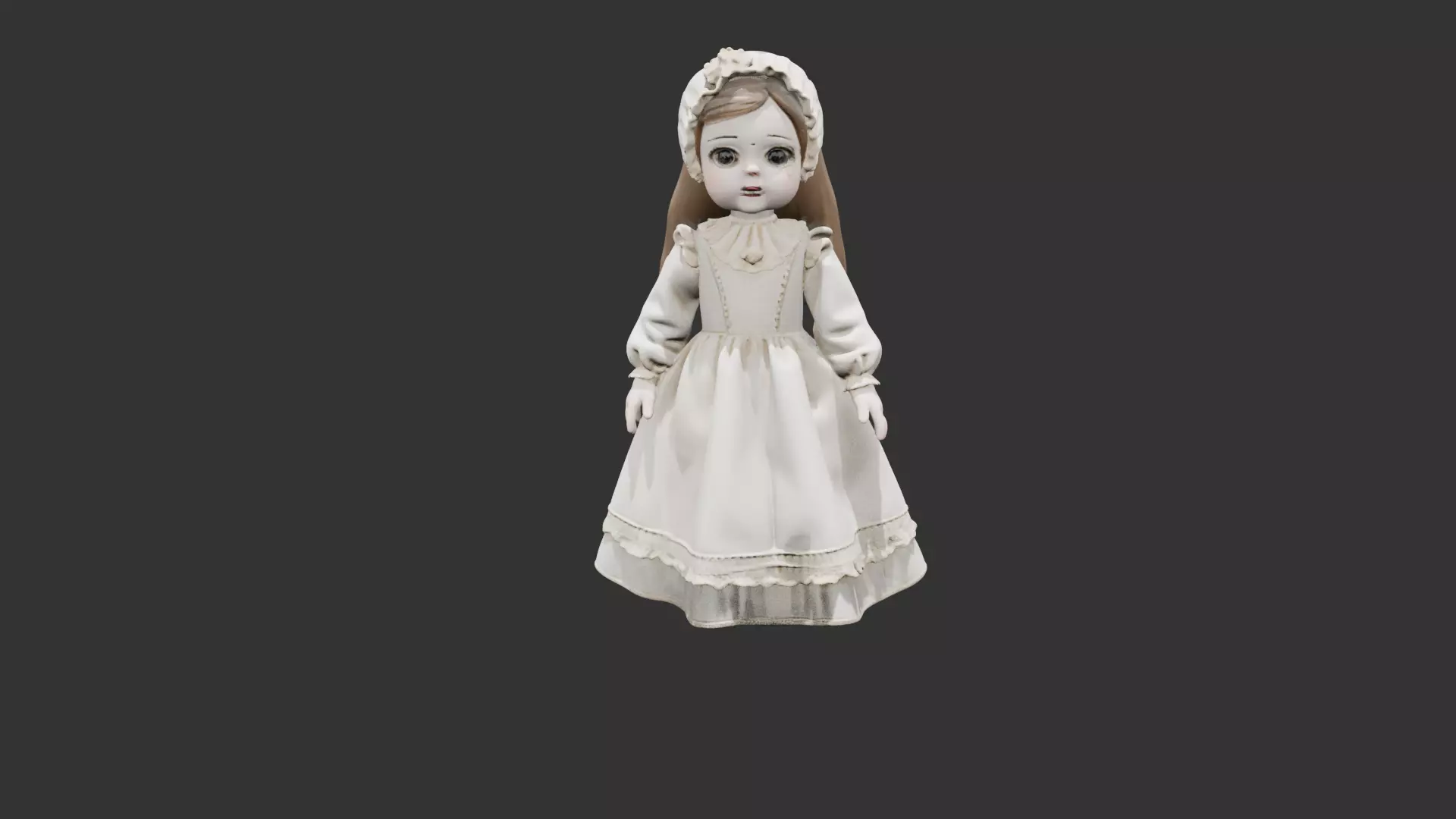 Old bride doll with cracked face, yellowed veil, and dead flower bouquet.