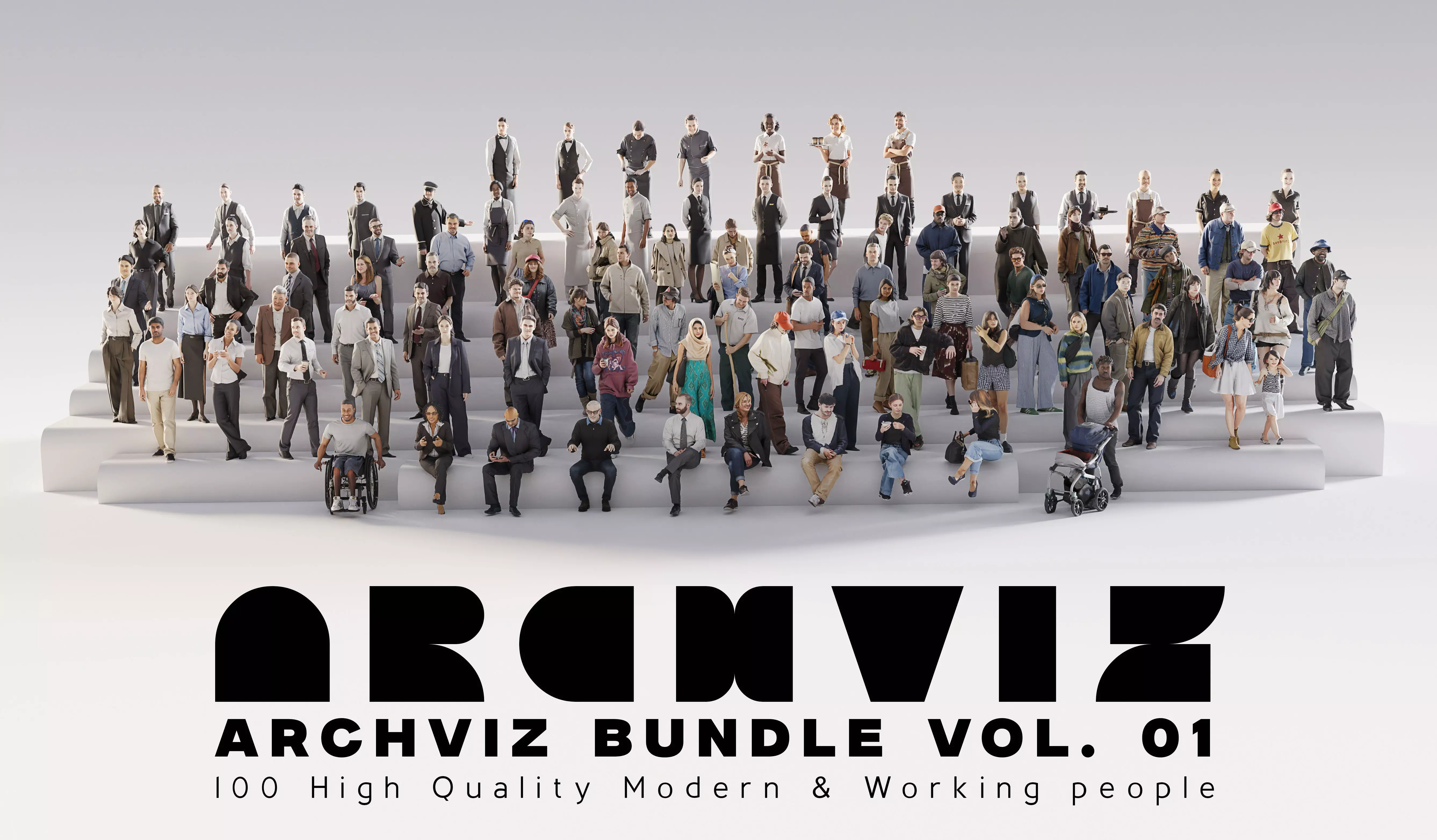 ArchViz People — Core Collection Vol. 01 is a comprehensive bundle of 100 professional character models designed to cover the most common use cases in architectural visualisation.