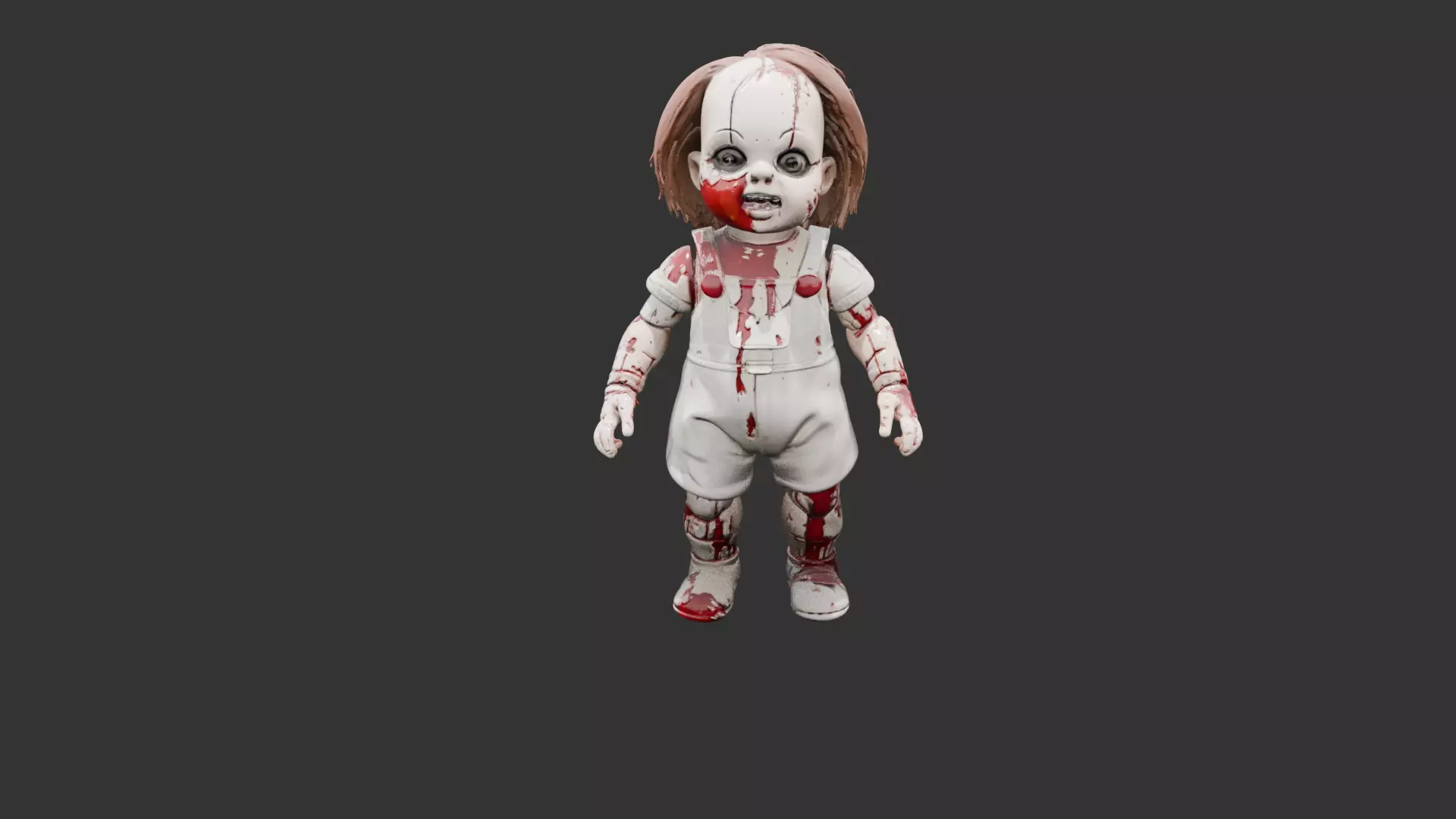 Cracked toy covered in realistic blood splatter, twisted limbs, and a creepy stare.
