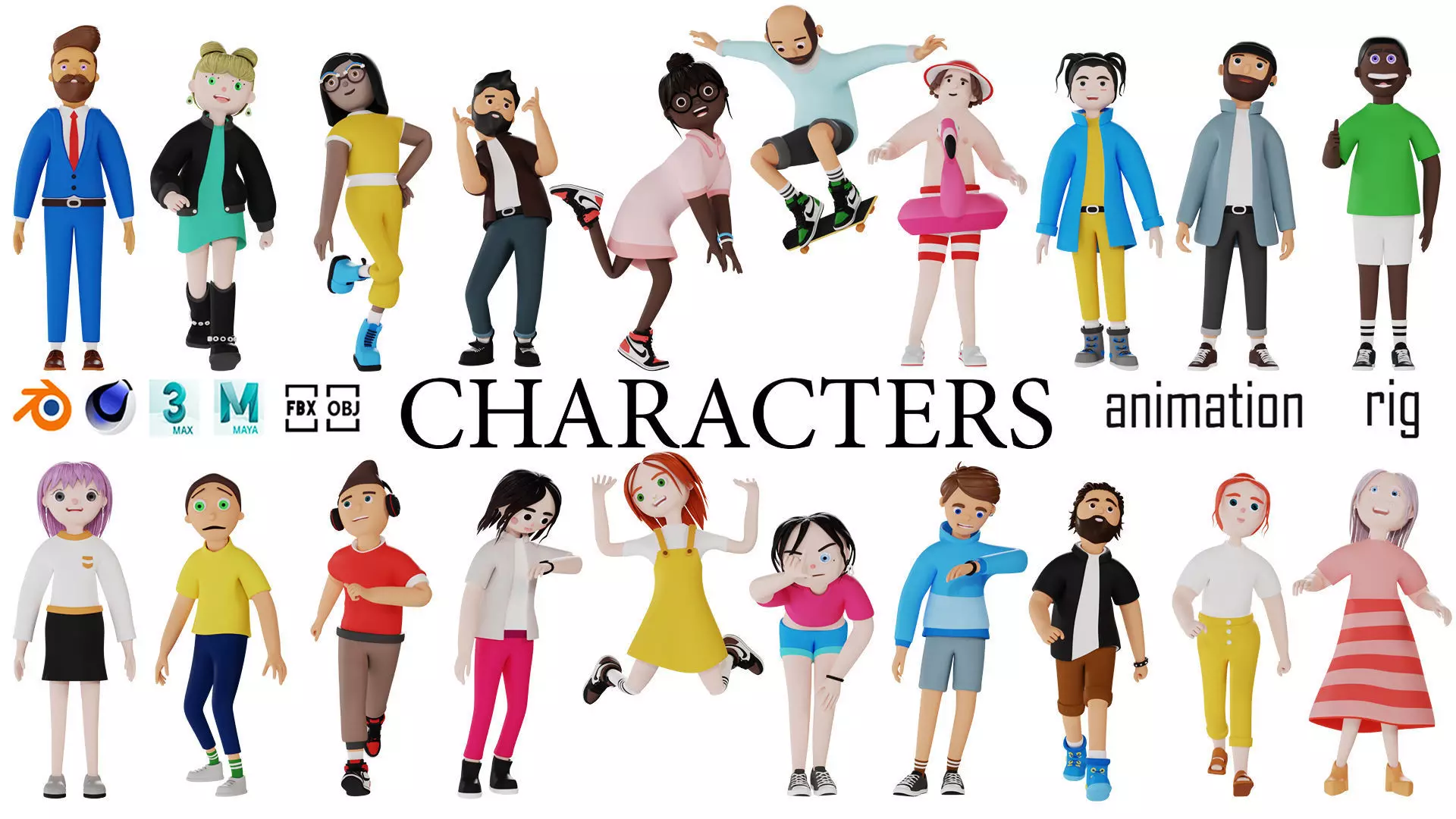 A pack of low-polygon 3d character models! An amazing collection of 20 character models. These 3d objects can be easily integrated into many digital media applications such as video games, applications, animation, rendering and any commercial projects.