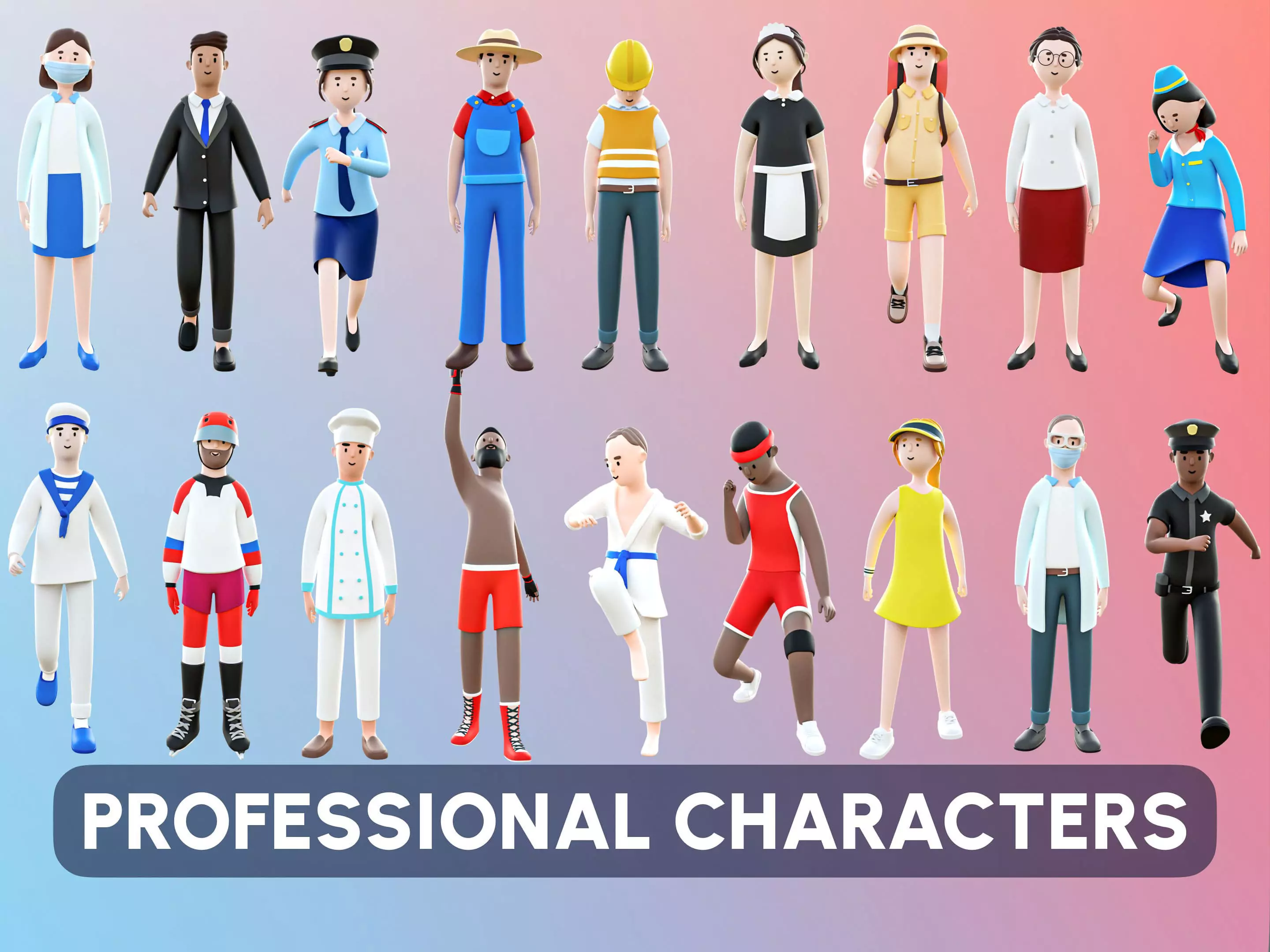 Add depth, role diversity, and realism to your game world with this collection of 25 stylized professional characters. This pack includes essential civilian jobs, athletes, service workers, and specialists — perfect for simulations, educational games, city builders, and any casual or stylized project.