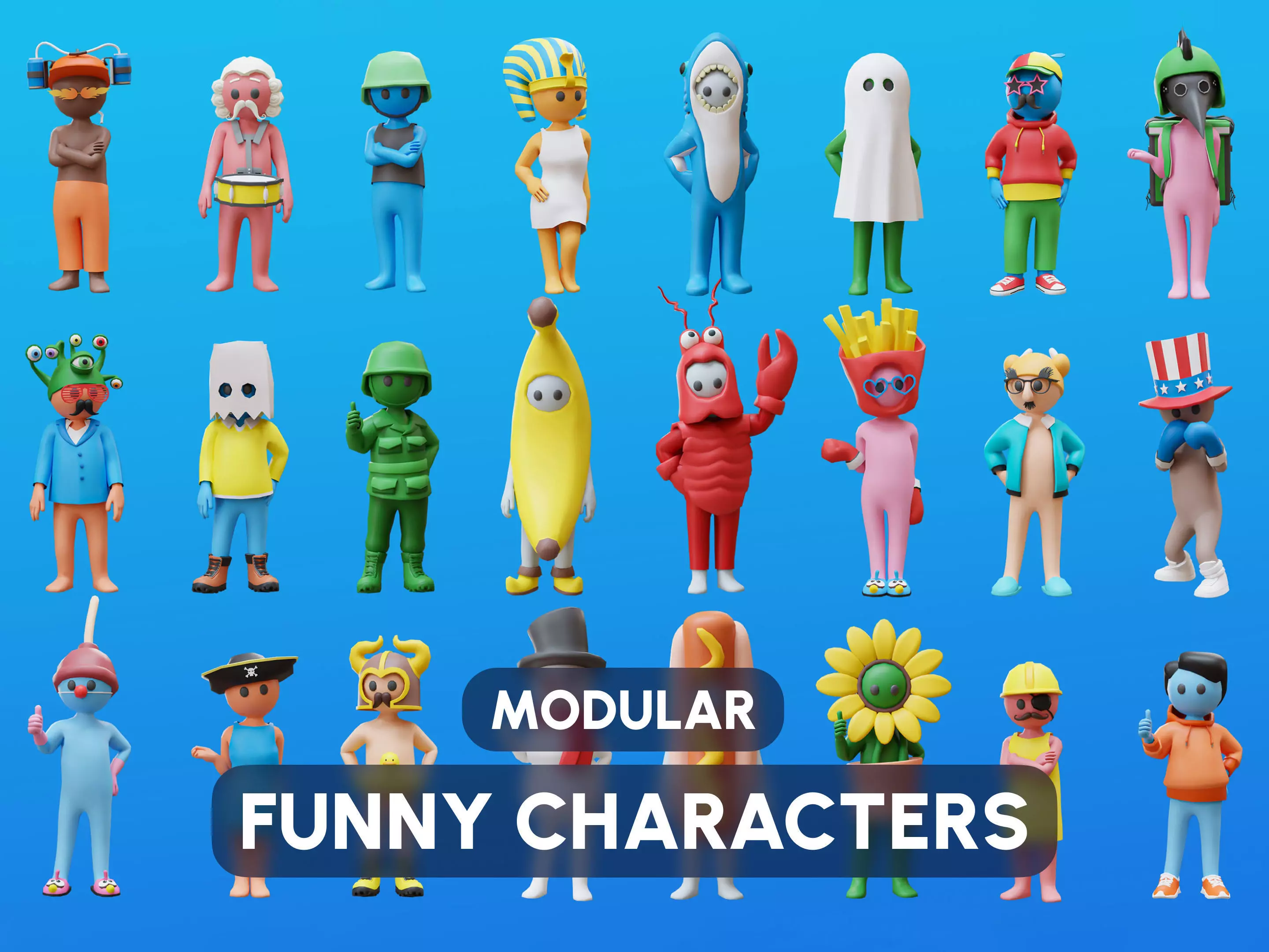 Funny Characters is a package of low-polygon 3D models optimized for game engines, to create fun, memorable characters, consisting of 518 unique assets