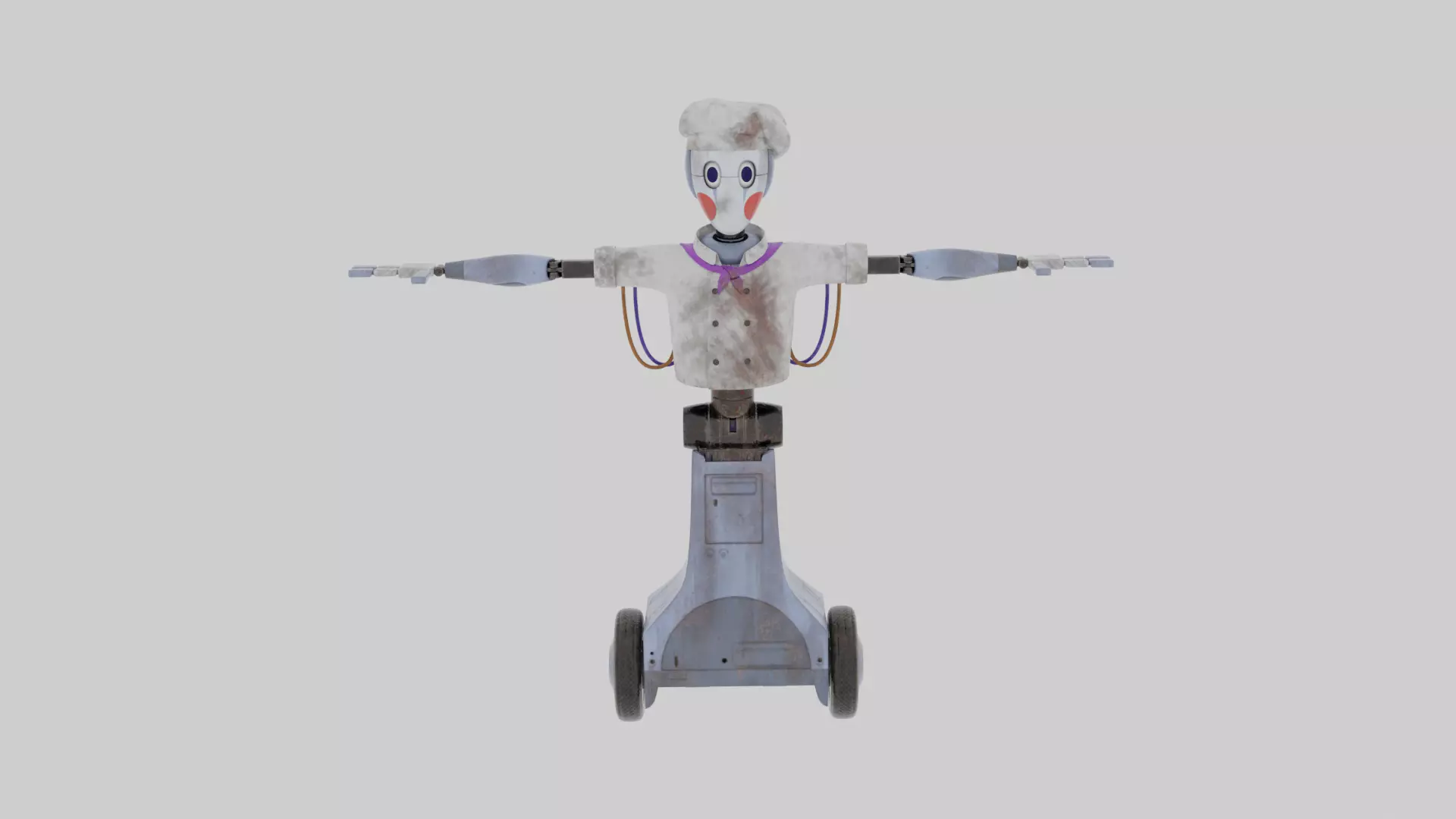 This model is theChef Bot character from the game Five Nights at Freddy . Along with the model you will get all the textures for it. And if your looking to animate with it your in luck because it comes rigged. It is game ready with a low poly count, but it still looks like a high quality model. You will get the model in 5 different formats: .blend, dae, mtl, obj, fbx. With these you can import the model into almost any 3d modeling software. You can see Chef Bot multiple times along the storyline of the game.
