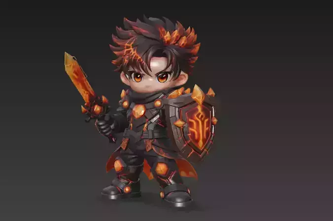This is a high-quality stylized chibi dark fire knight 3D model, inspired by embers, molten runes, and shadow-infused flame energy.The character features super-deformed (chibi) proportions, dark armored plating, glowing ember crystals, a blazing sword, and a rune-etched shield radiating fiery power.