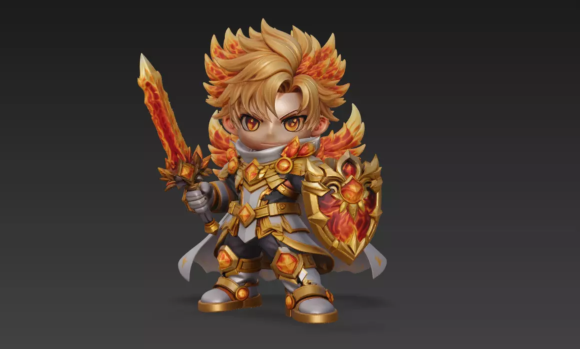 This is a high-quality stylized chibi radiant sun knight 3D model, inspired by solar energy, golden flames, and divine fire guardians.The character features super-deformed (chibi) proportions, radiant gold armor, blazing sun-fire wings, a flaming sword, and an ornate shield infused with solar power.