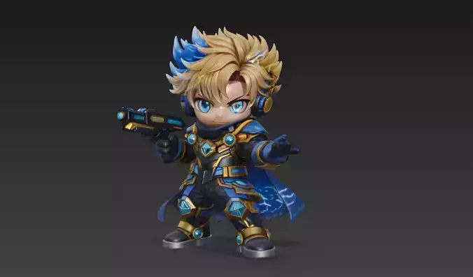 This is a high-quality stylized chibi sci-fi hero 3D character, designed with a futuristic shooter theme and a confident combat-ready pose.The character features large expressive blue eyes, spiky dual-tone hair, advanced tech armor, a glowing energy pistol, and a flowing cyber cape with digital effects.
