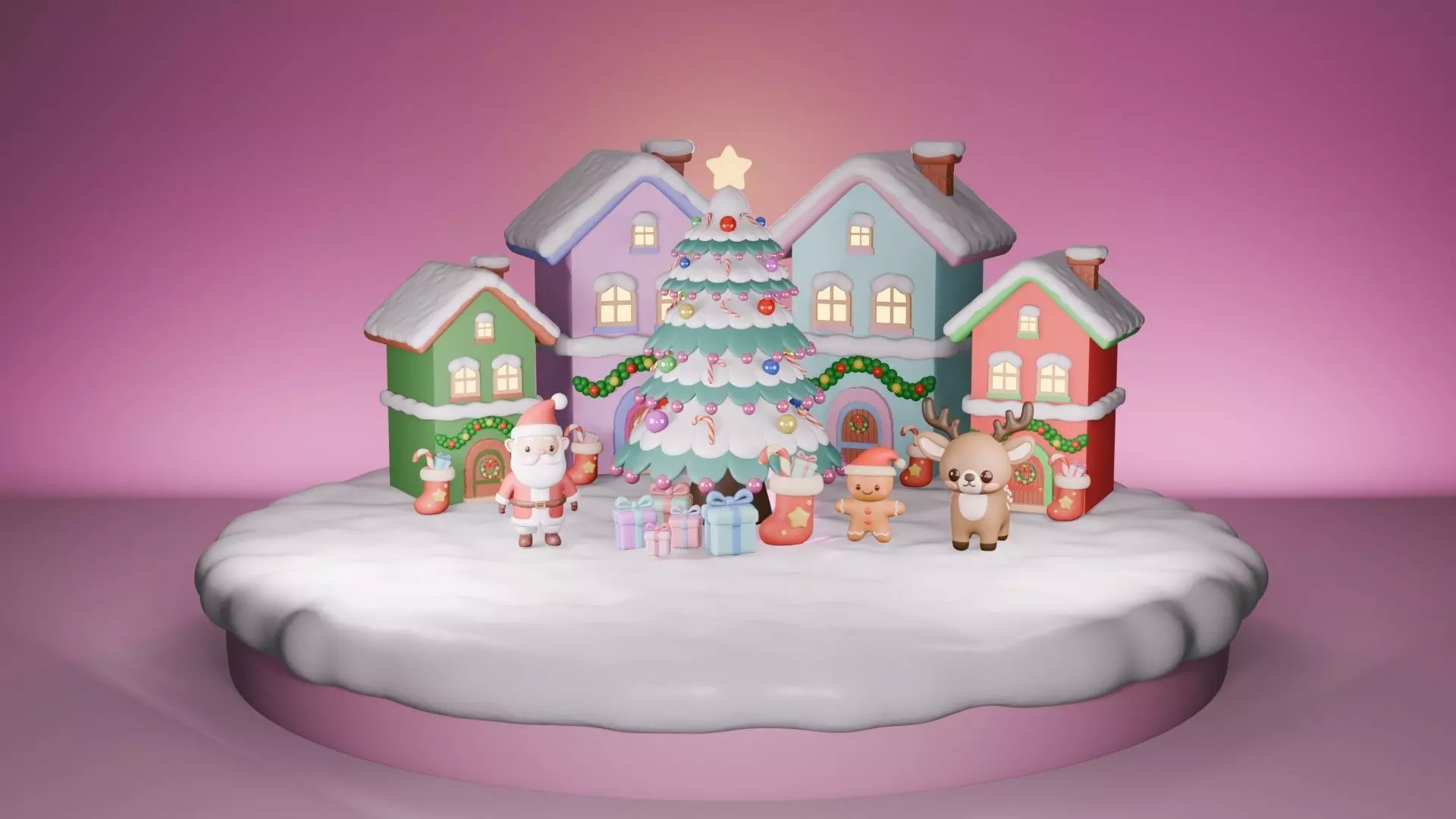 Bring a cozy holiday mood to your project with this cute stylized Christmas 3D asset bundle. The set includes a Christmas village diorama and individual assets such as Santa, reindeer, gingerbread character, Christmas tree, wreath, stocking, gift box, and candy cane—perfect for illustrations, and festive product renders.