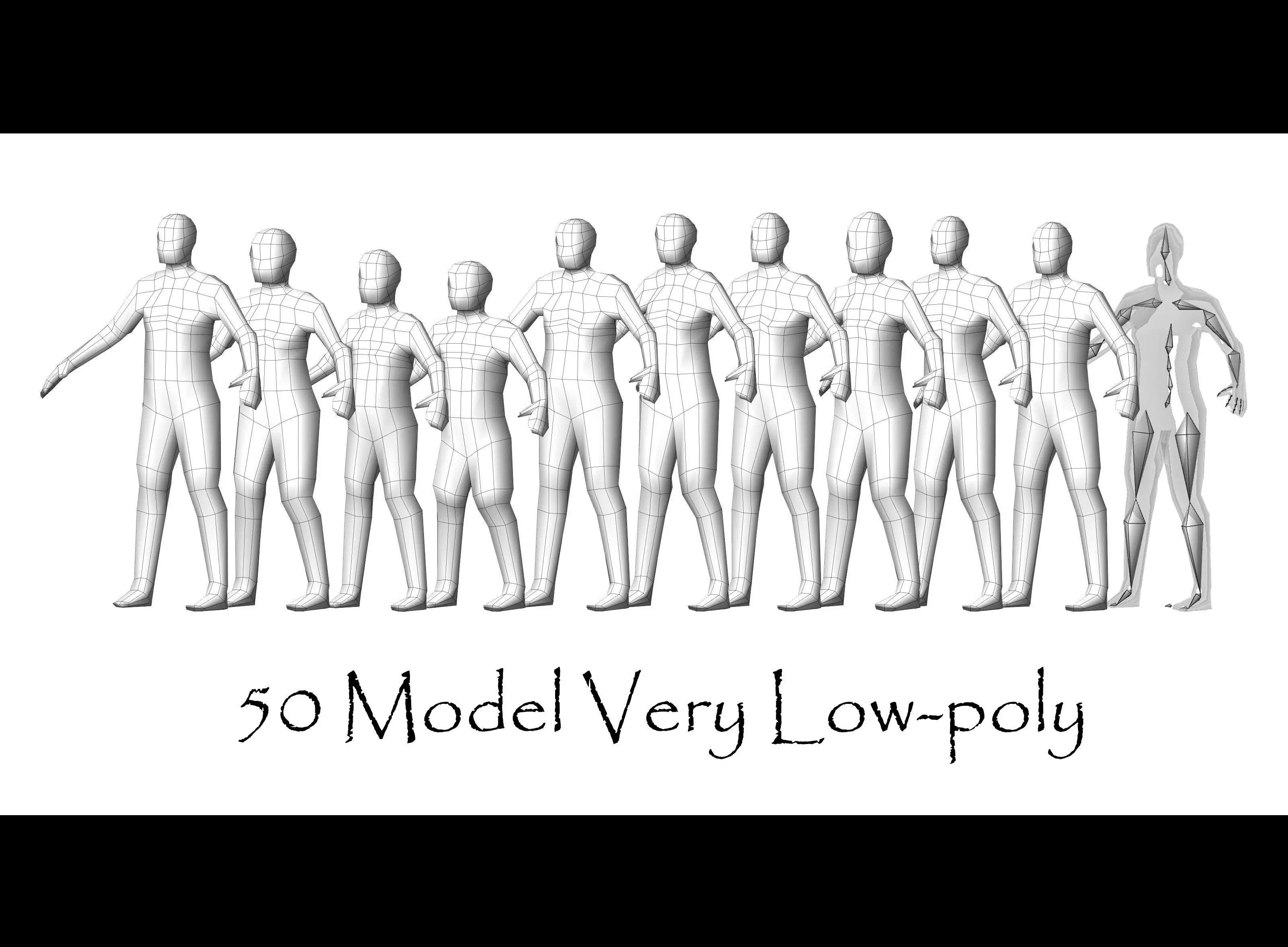 Collection Characters Very Low-poly - 50 Body Male and FemaleFormats : fbx obj stl marmoset png(textures)include:50 model fbx low-poly50 model obj low-poly50 model stl low-poly1 marmoset file2 textute png 2048*2048 Resolution....................................A collection of 50 3D models of male or female or child characters is prepared for you.There are also 2 textures in this collection that you can use any texture for any of the models.Rigged simple for Game mode....................................tags : 3d 3dmodel character male female child collection pack cg game rigged fbx obj stl marmoset png human body man woman lowpoly