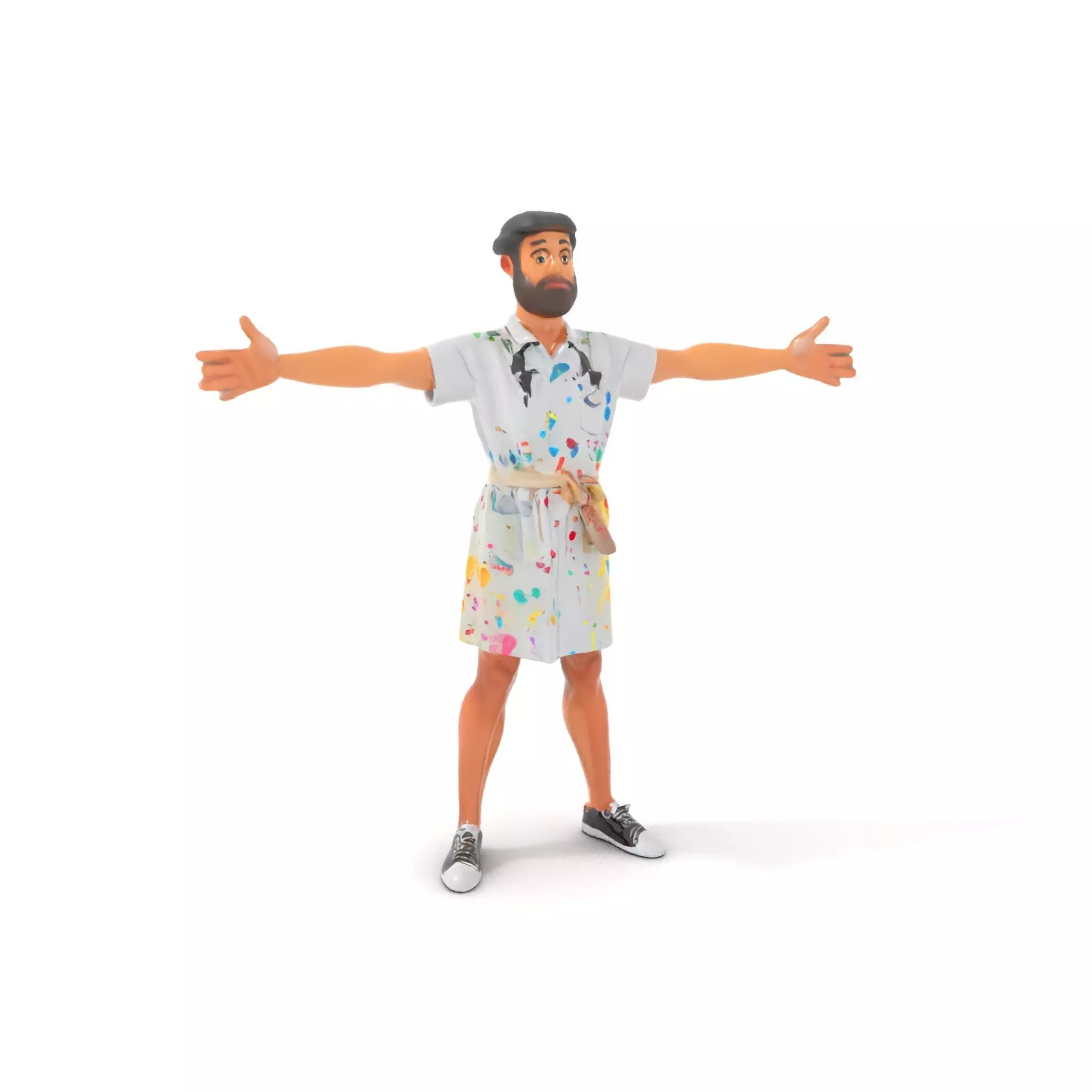 This colorful artist 3D model is vibrant, featuring an expressive character with paint-splattered attire, perfect for creative scene designs or animations.