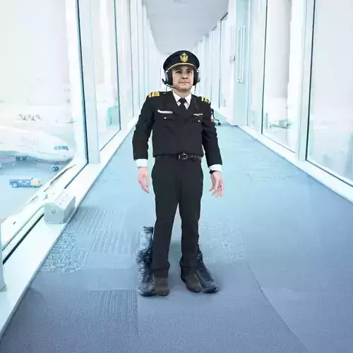 A commercial airline pilot wears a crisp dark navy uniform with a white shirt, tie, and shoulder epaulets, plus a peaked cap with an embroidered badge, and an aviation headset with a boom microphone resting over one ear, standing in a modern airport terminal corridor near large windows with a parked passenger jet and ground service vehicles visible outside in soft daylight; pose: standing upright in a T-pose with arms extended straight out to the sides, palms facing the camera (open palms), hands empty.Included animation of Idle, Walking, Running etc. It's full compatible with Mixamo RIG.