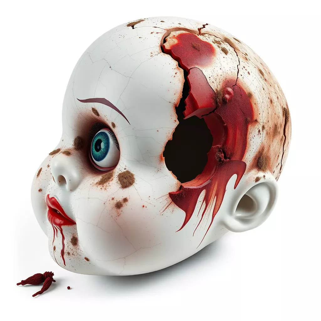 Presenting a meticulously crafted 3D model of a heavily damaged and unsettling doll head, designed to evoke a sense of dread and mystery. This model features a detailed cracked porcelain texture, suggestive of age and severe wear, complemented by realistic dirt and grime accumulation. A prominent, jagged hole reveals a gruesome, blood-splattered interior, with realistic blood drips flowing from the damage and the doll's mouth. The single, piercing blue eye and vibrant red lips stand in stark contrast to the decay, enhancing its eerie presence.