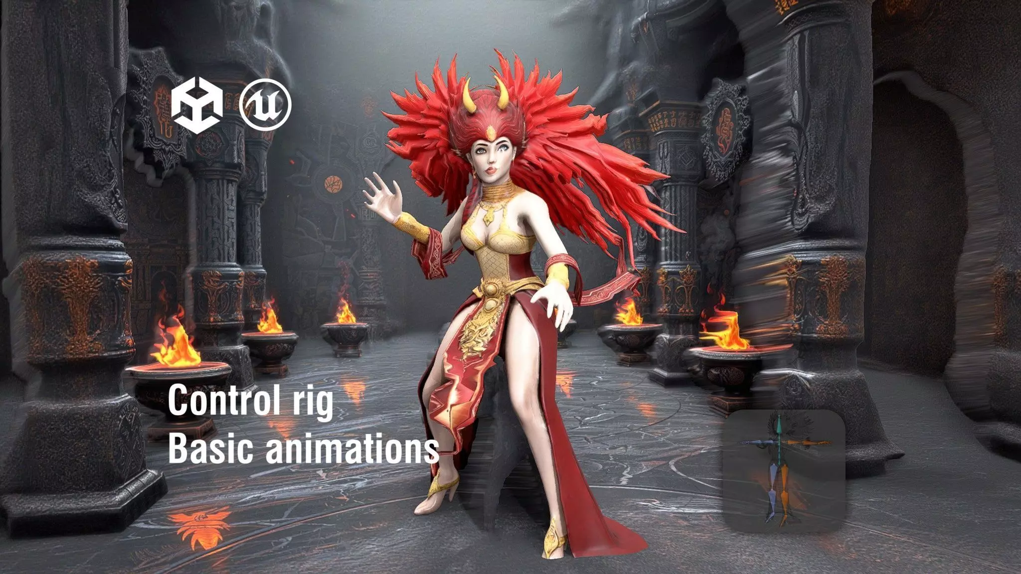 Game-ready character asset for real-time engines: designed for gameplay and cutscenes, with striking materials and bold color contrast that stands out under HDRP lighting and dramatic VFX setups.Stylized realistic demon priestess/sorceress with pale skin and a dramatic crimson feathered headdress crowned by horns, wearing ornate red-and-gold ceremonial armor and jewelry. A perfect hero or boss character for dark fantasy, eastern-inspired temples, ARPGs, and cinematic scenes—instantly readable silhouette with premium detail.