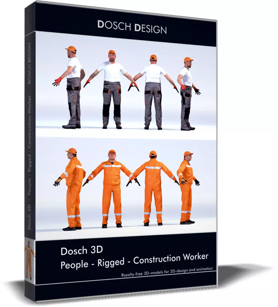 DOSCH 3D: People - Rigged - Construction Worker is a remarkable 3D model pack that caters to the needs of those who require realistic 3D models of construction workers. The pack consists of five fully textured and rigged 3D-models, which are designed to meet the requirements of various 3D projects.